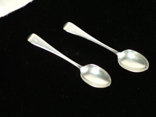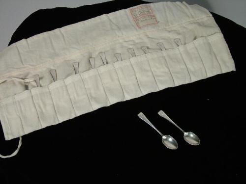 Set of 13 English silver coffee spoons, engraved with a "V" in front of the handle, purchased in England in 1935, 4 1/2" by 1"