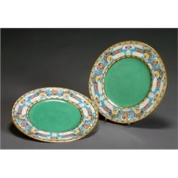 Each having a green center within a polychrome scrolling foliage and fruit border. Each with green printed factory mark and puce pattern number W1371.