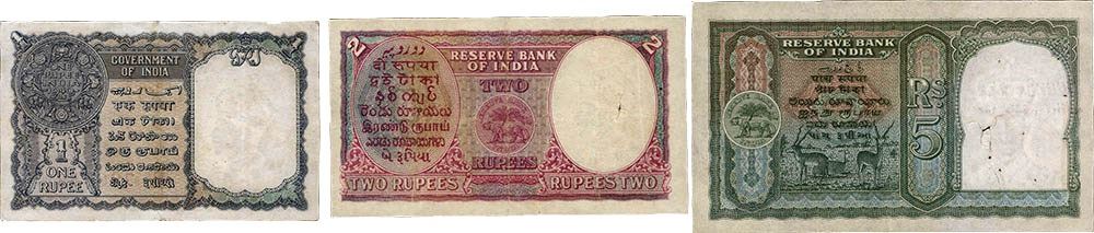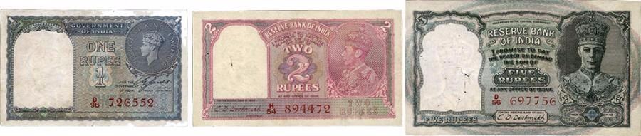 1. King George VI, 1947, 1 Rupee, Signed by C E Jones, D Prefix, serial no in red, S.No. D96 726552, stained,(KJ RR # 4.1.1D),about extremely fine.2. King George VI, 1949, 2 Rupees, Signed by C D Deshmukh, H Prefix, serial no in red, S.No. H54 894472, pin holes, thread holes, (KJ RR # 4.2.3), about extremely fine.3. King George VI, 1947, 5 Rupees, Signed by C D Deshmukh, D Prefix, serial no in red,S.No. D56 697756, pin holes, thread holes, (KJ RR # 4.4.2), about very fine.Red Serial number significance that this note was issued after independence.
