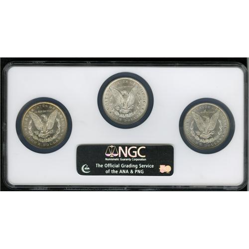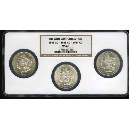 <B>Set of Three Carson City Morgan Dollars MS65 NGC.</B></I> An attractive three-piece set of Carson City dollars in a single NGC holder, named "The Wild West Collection." The set includes: <B>1882-CC MS65,</B></I> nicely struck with pleasing luster; <B>1883-CC MS65,</B></I> a lovely piece with clean obverse fields; and an <B>1884-CC MS65,</B></I> solidly struck with a patch of olive-green toning near the eagle's head.
