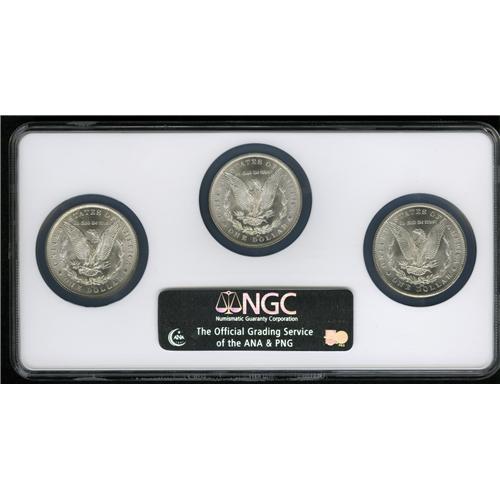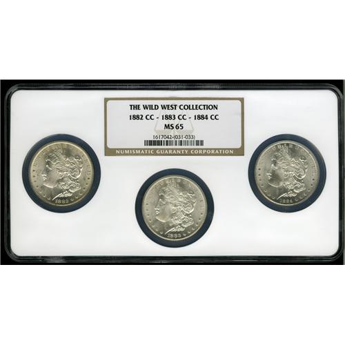 <B>Set of Three Carson City Morgan Dollars MS65 NGC.</B></I> Housed in a custom NGC holder titled "The Wild West Collection," the set includes: <B>1882-CC MS65,</B></I> a nicely struck piece with light patina at the reverse periphery; <B>1883-CC MS65,</B></I> highly lustrous with an exceptionally clean reverse; and an <B>1884-CC MS65,</B></I> a subtly toned piece with strong luster.