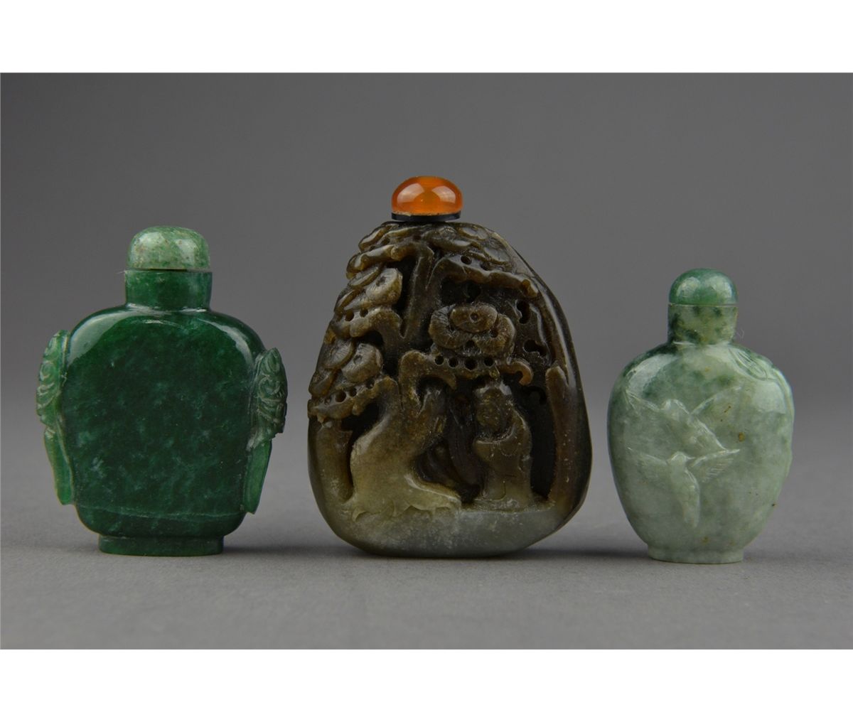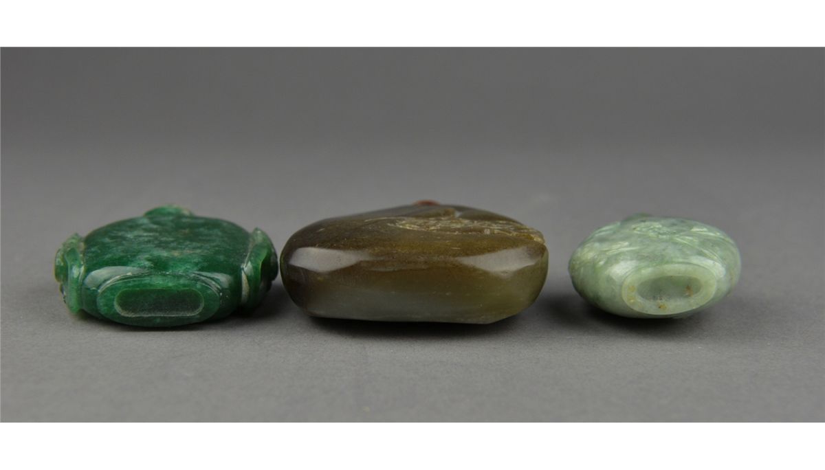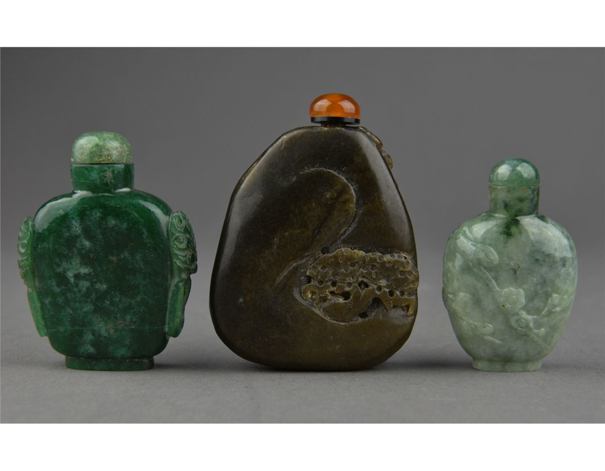 Three Chinese carved jade snuff bottles; all three possess matching stoppers; H: 5.5 cm, 44 grams (shortest) H: 5.75 cm, 53 grams (medium), H: 7 cm, 106 grams (largest). Provenance: Liao Collection Vancouver