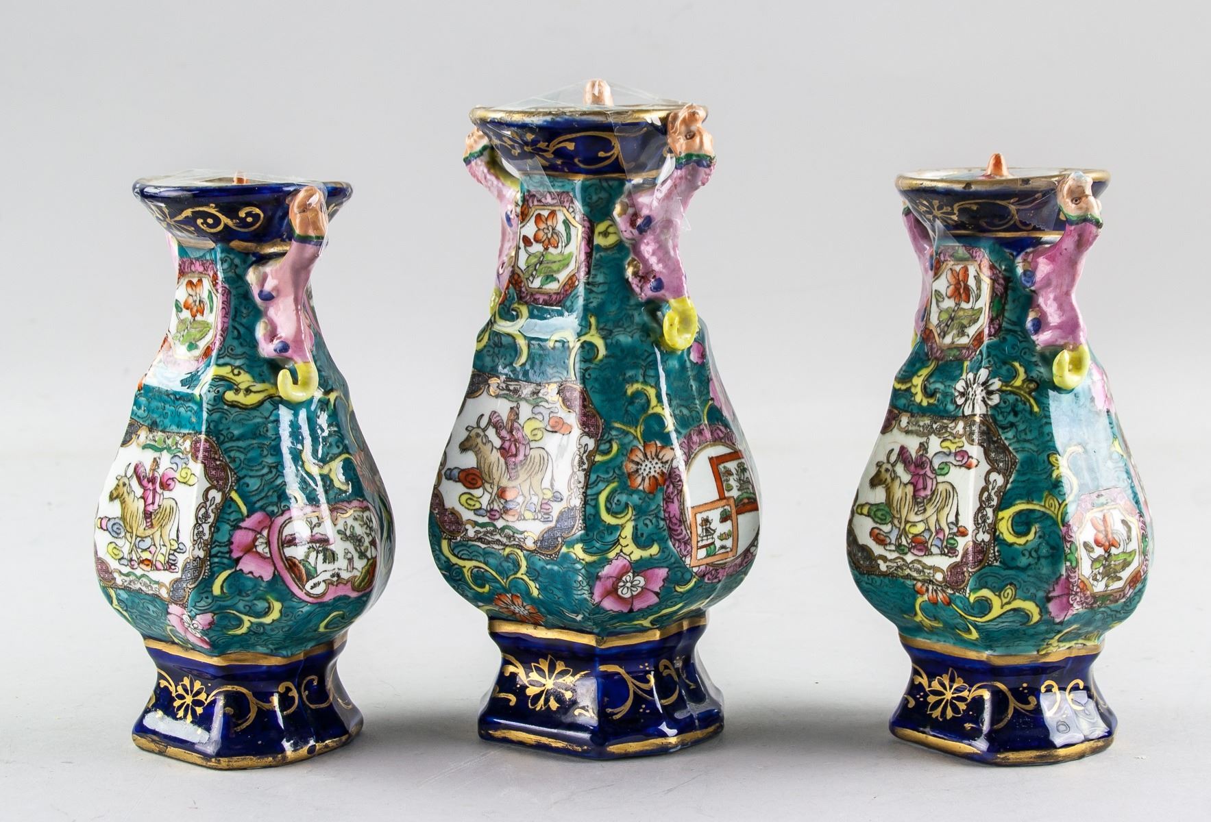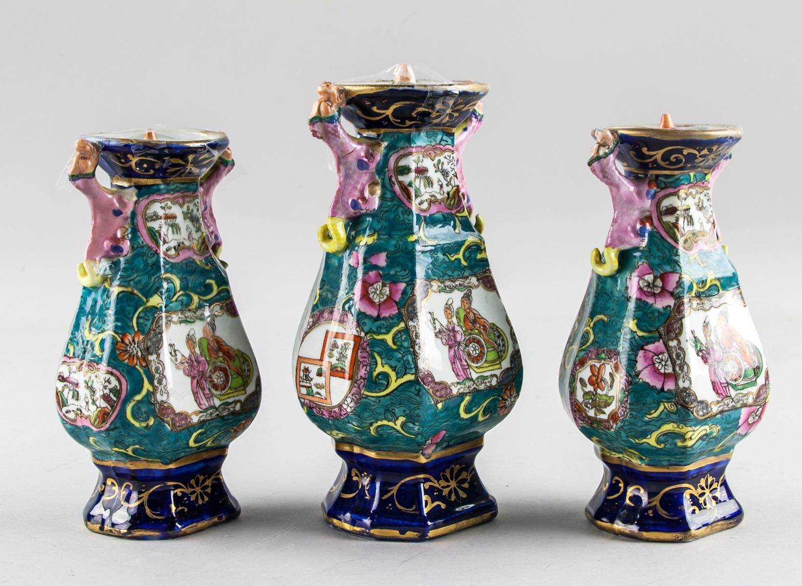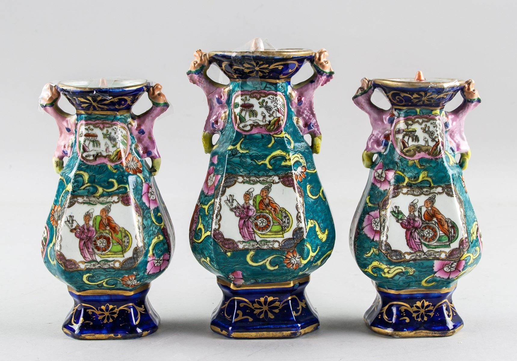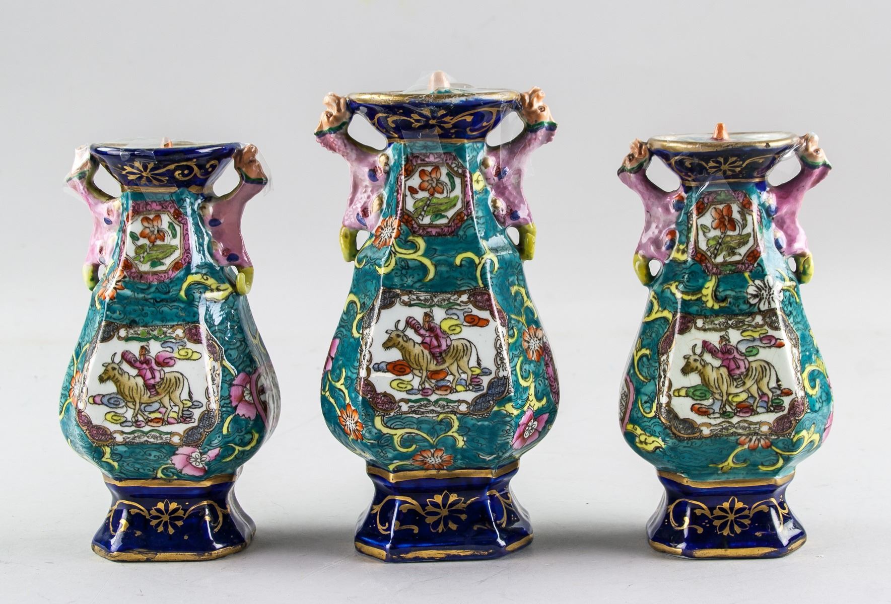 Set of three, 20th century Chinese famille rose porcelain vase set, of lobed pear shape body with cap, supported on splayed foot rim, with splayed mouth rim, flanked with tow beast form handles, painted with figures, decorated with floral and leafy pattern, six-character Qing dynasty Jiaqing mark on base, 17 x 10 cm, 871 grams