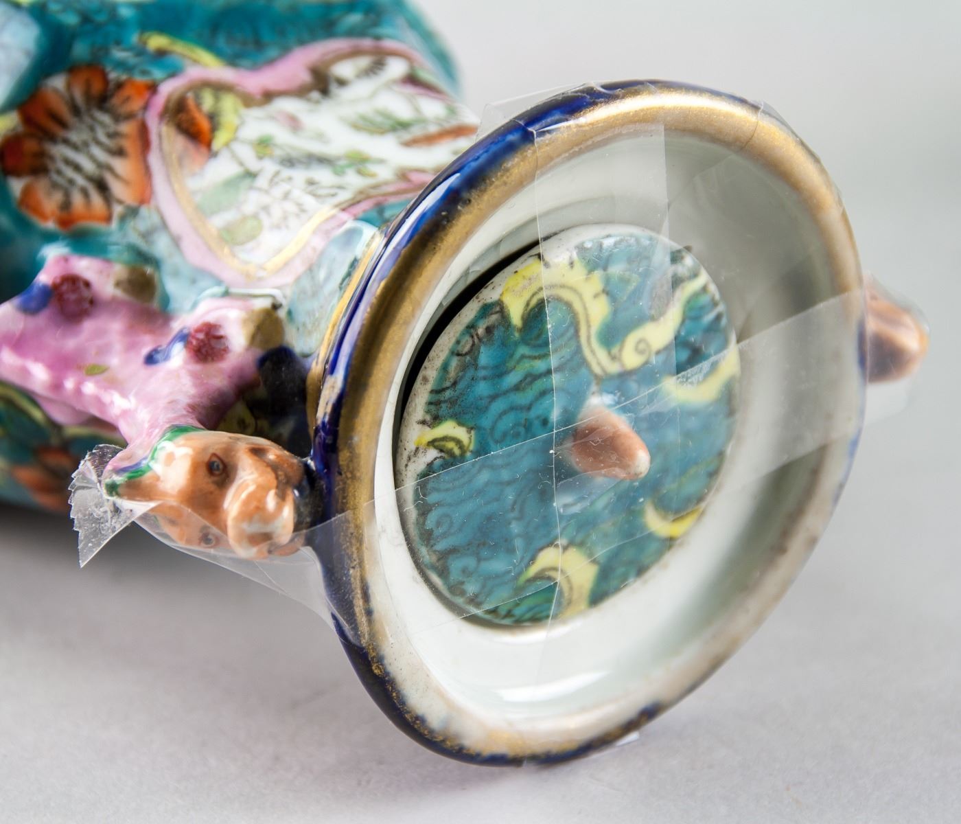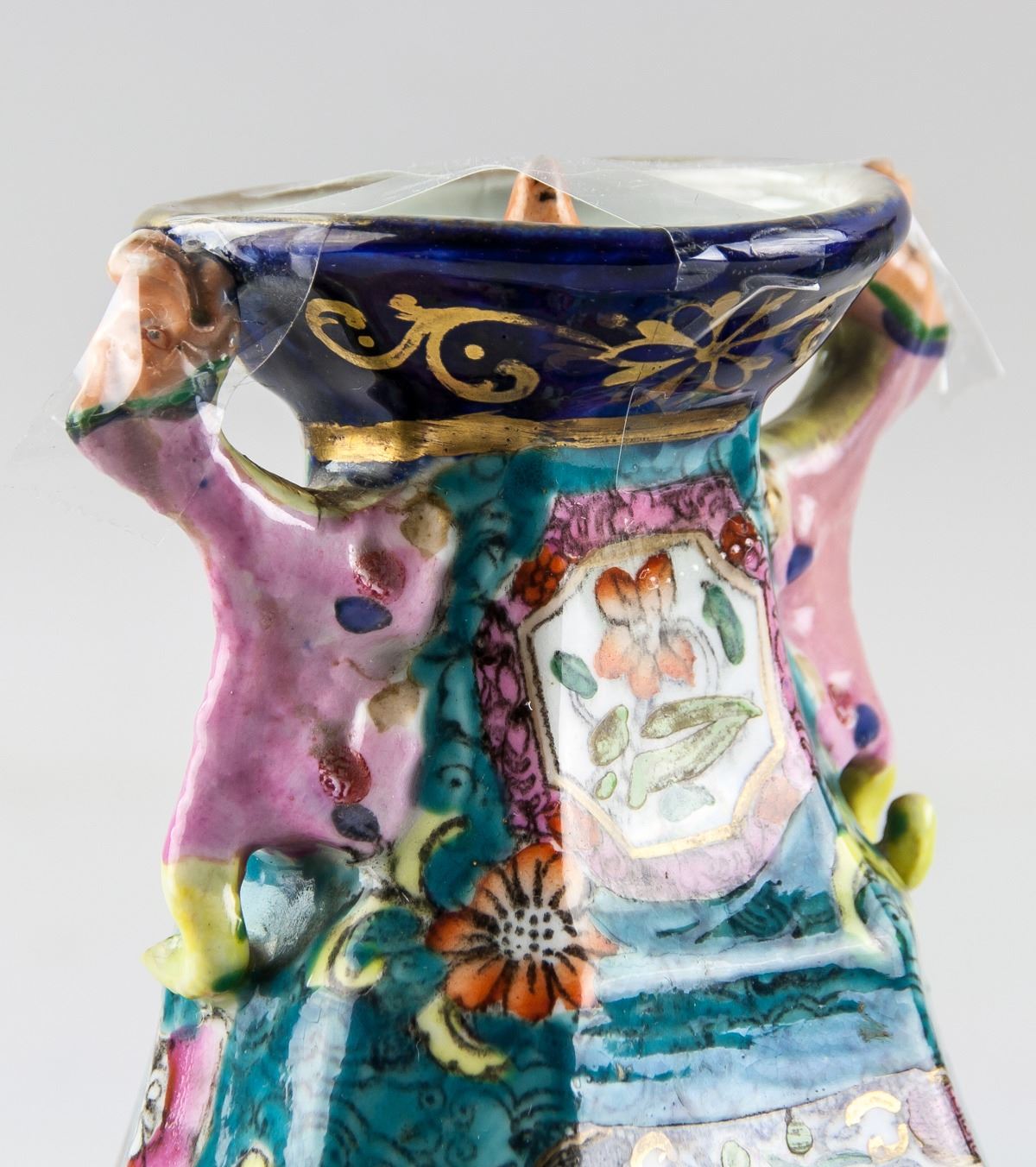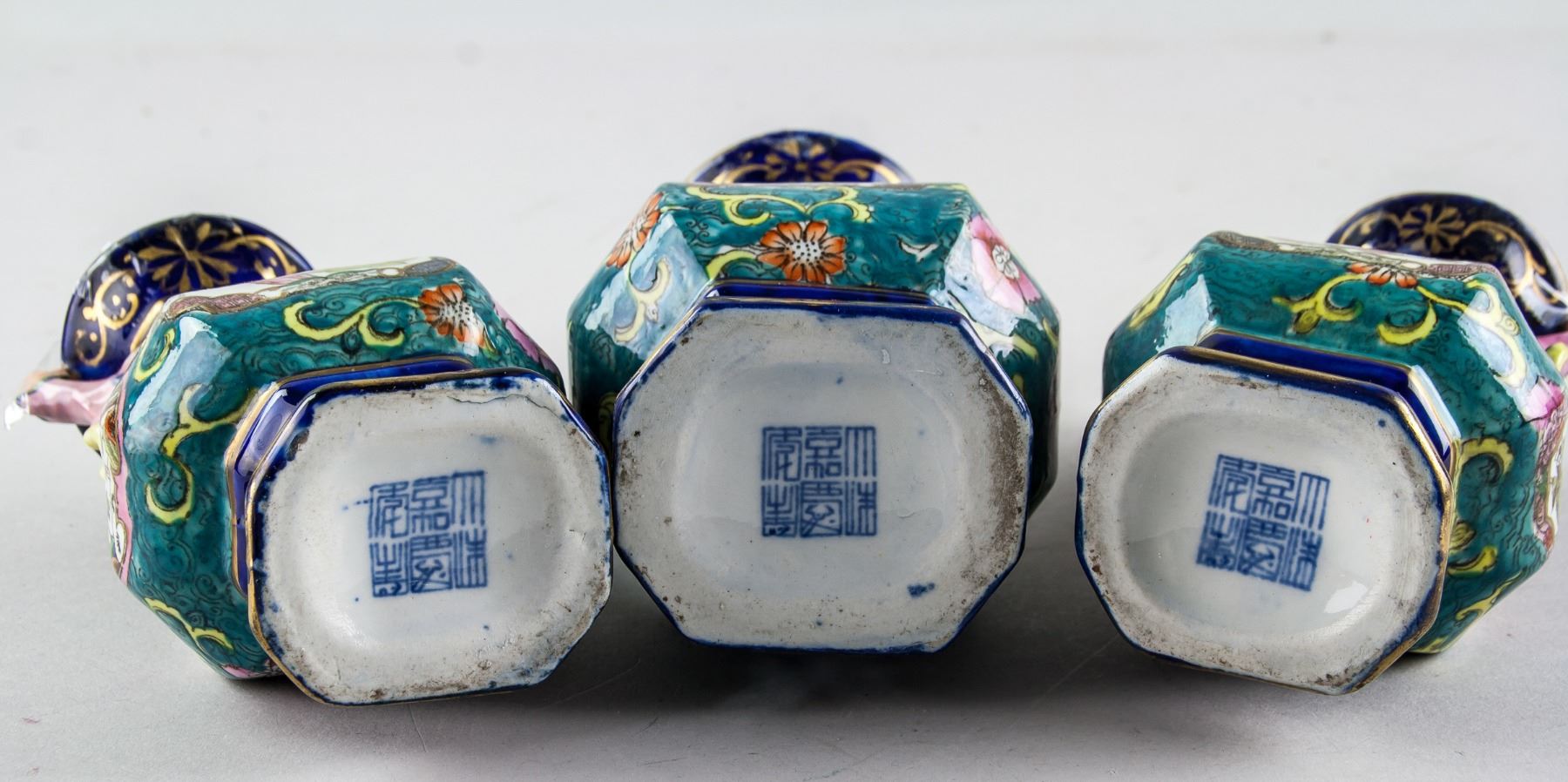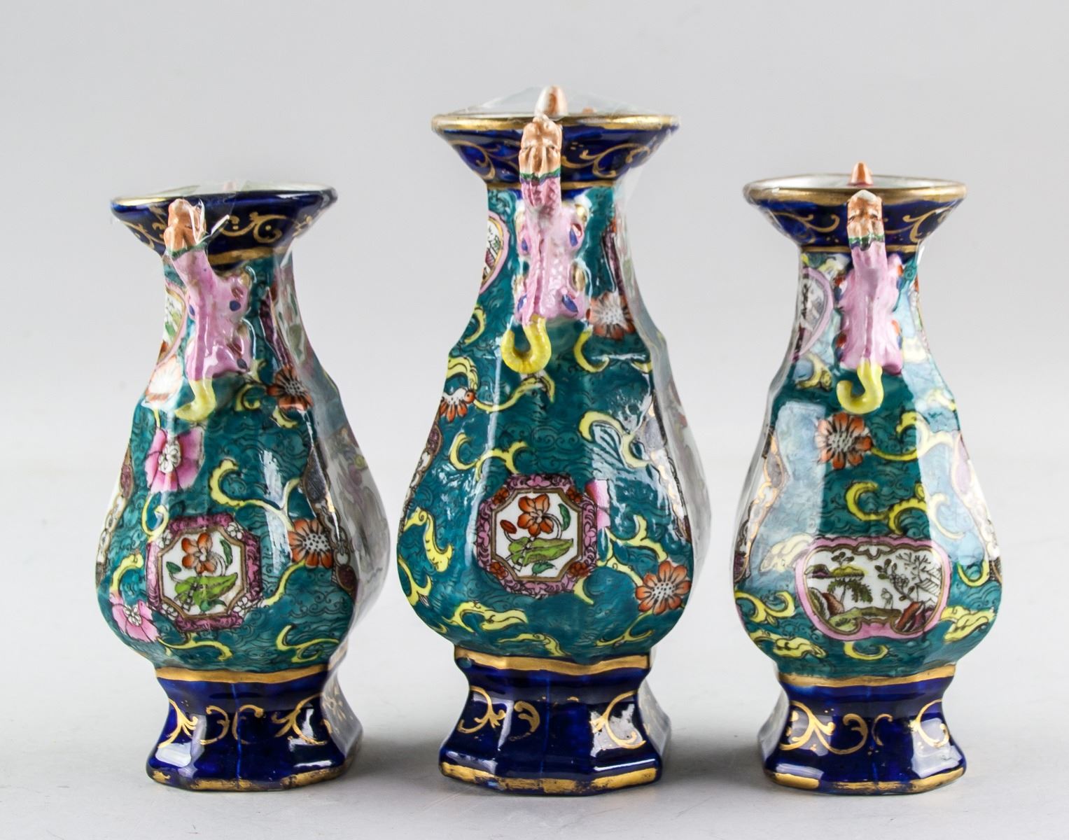 Set of three, 20th century Chinese famille rose porcelain vase set, of lobed pear shape body with cap, supported on splayed foot rim, with splayed mouth rim, flanked with tow beast form handles, painted with figures, decorated with floral and leafy pattern, six-character Qing dynasty Jiaqing mark on base, 17 x 10 cm, 871 grams