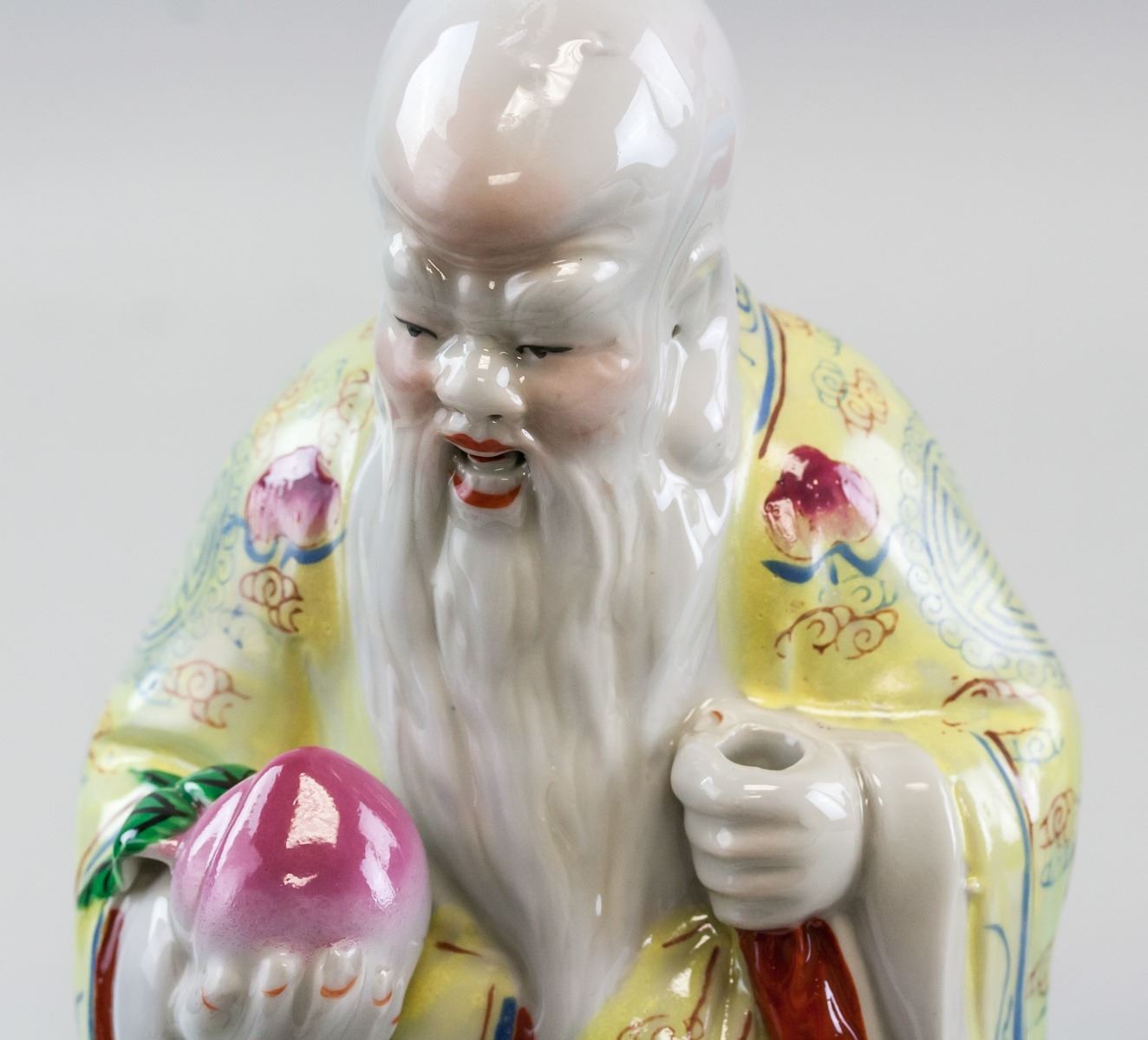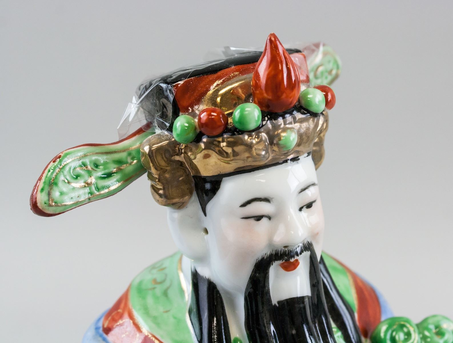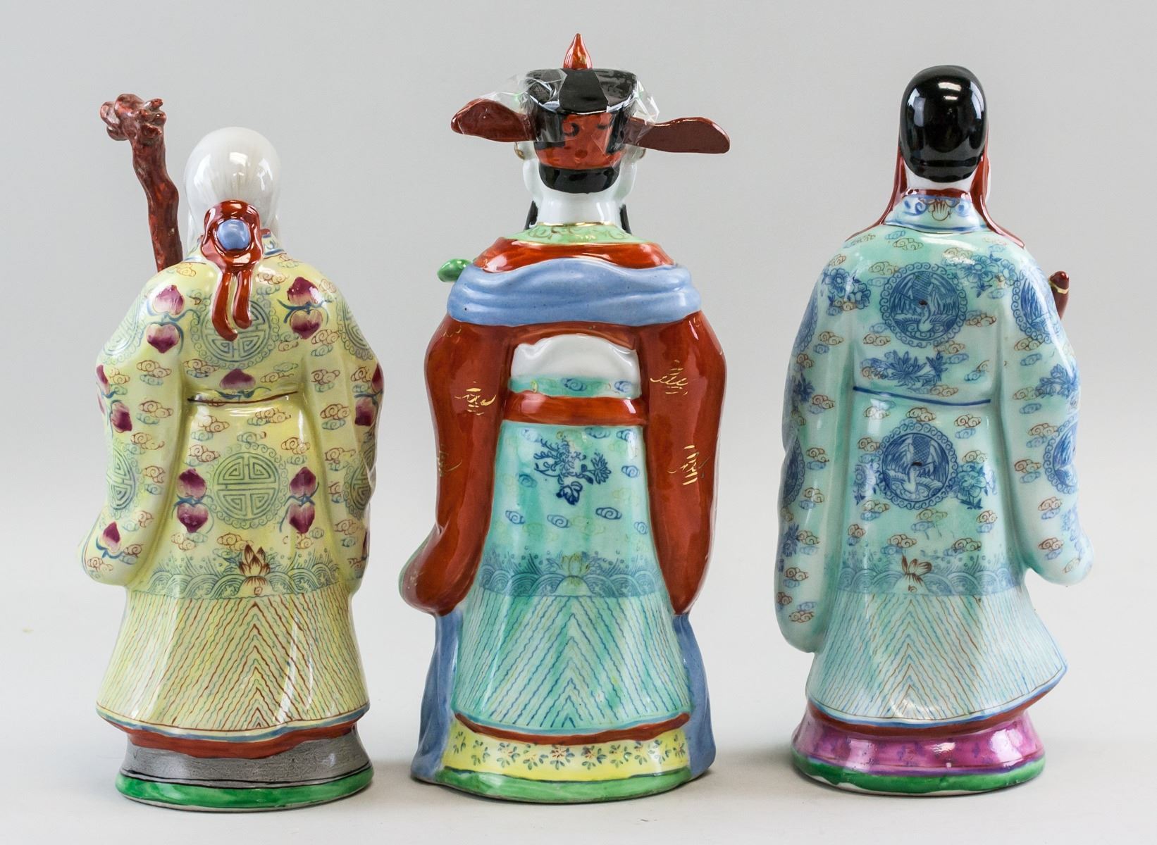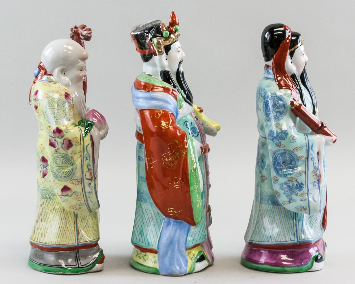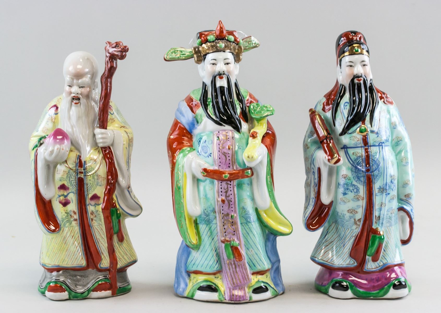 Set of three (3) Chinese porcelain statues. Of Fu Lu Shou. 30 x 14 cm 1214 grams. 27 x 13 cm, 1149 grams. 29 x 13 cm, 1183 grams..