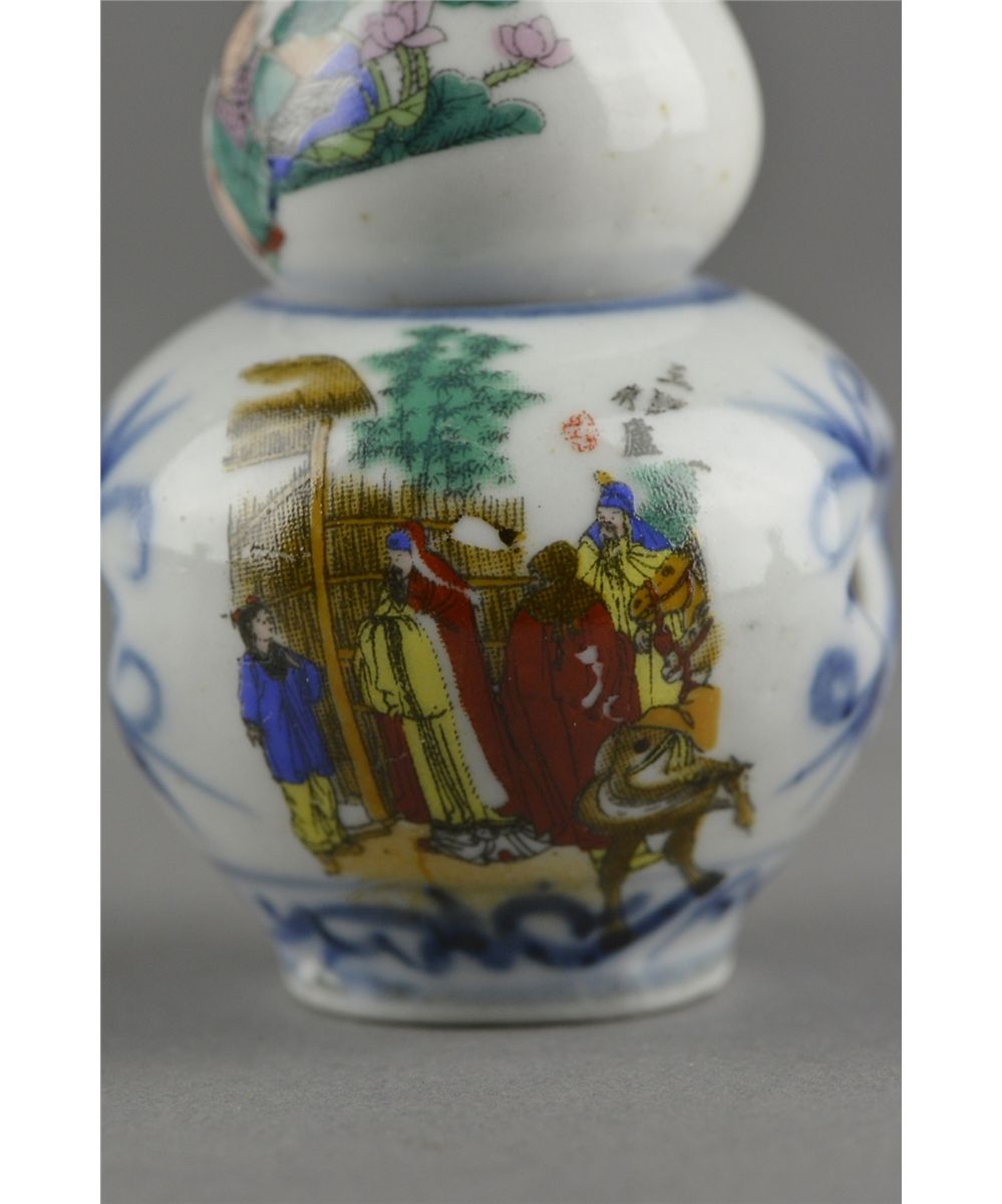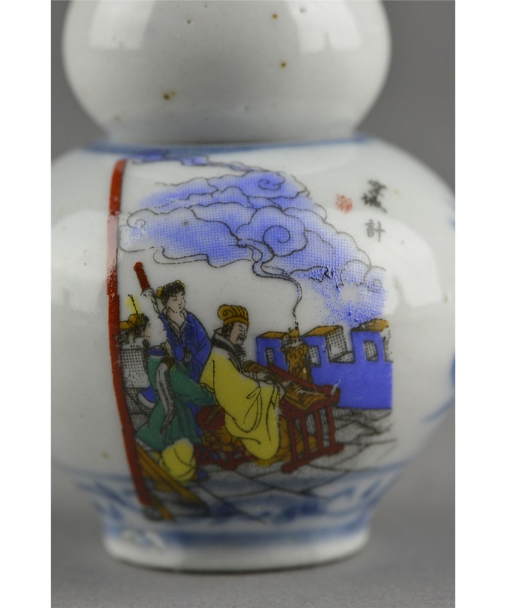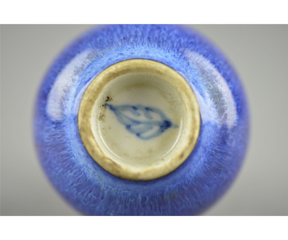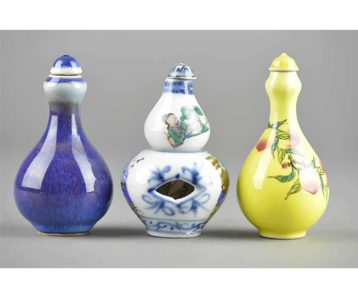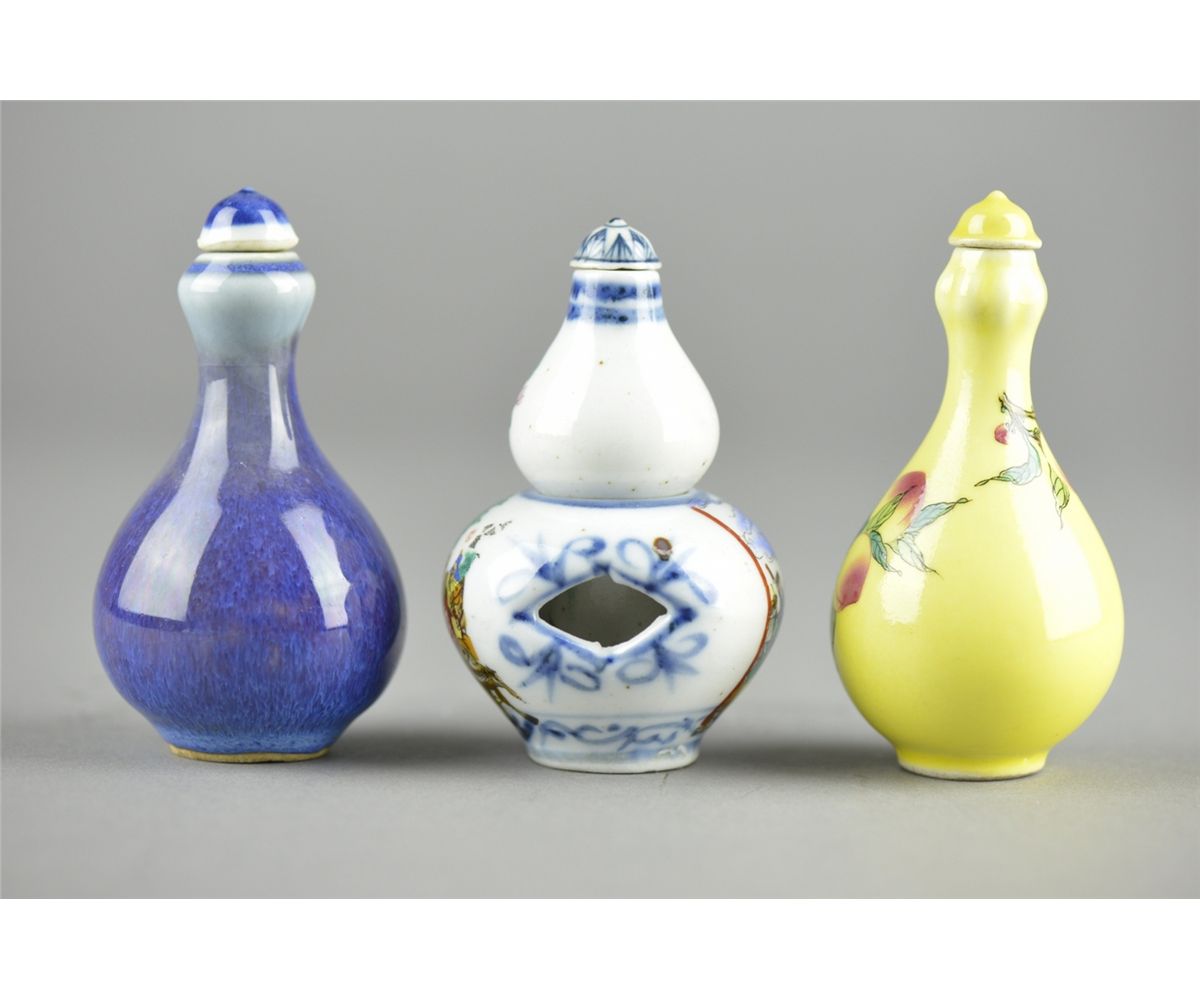 Set of three Chinese porcelain snuff bottles; featuring a yellow porcelain peach snuff bottle, blue and white double gourd porcelain snuff bottle, and flambe glazed porcelain snuff bottle; marked on base; H: 8 cm