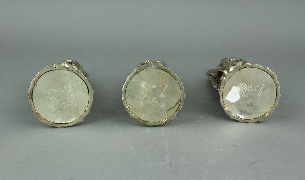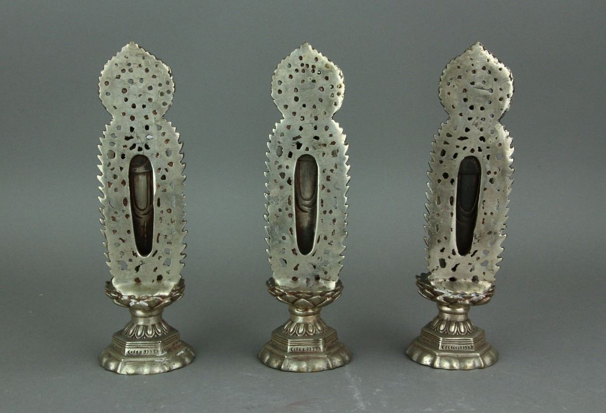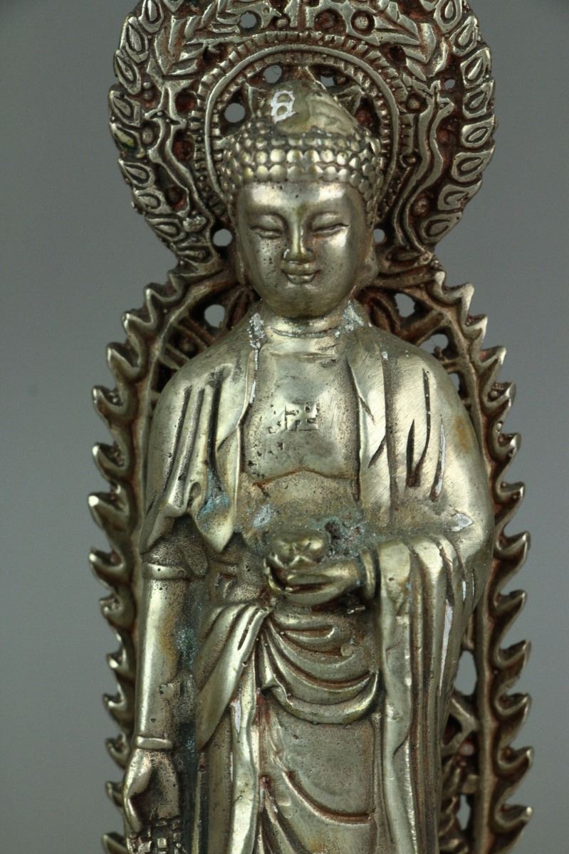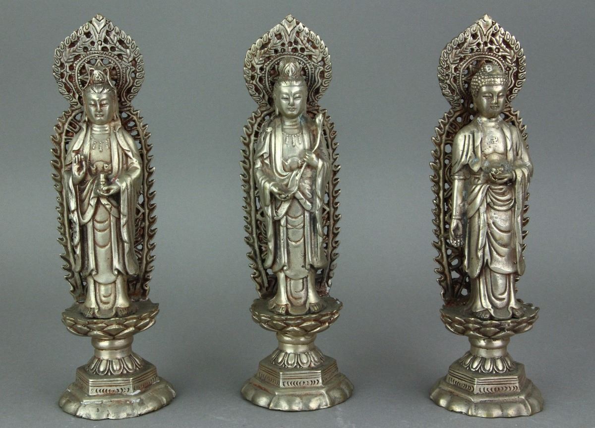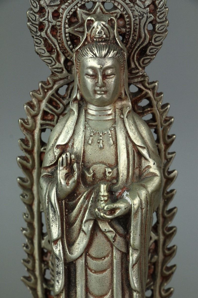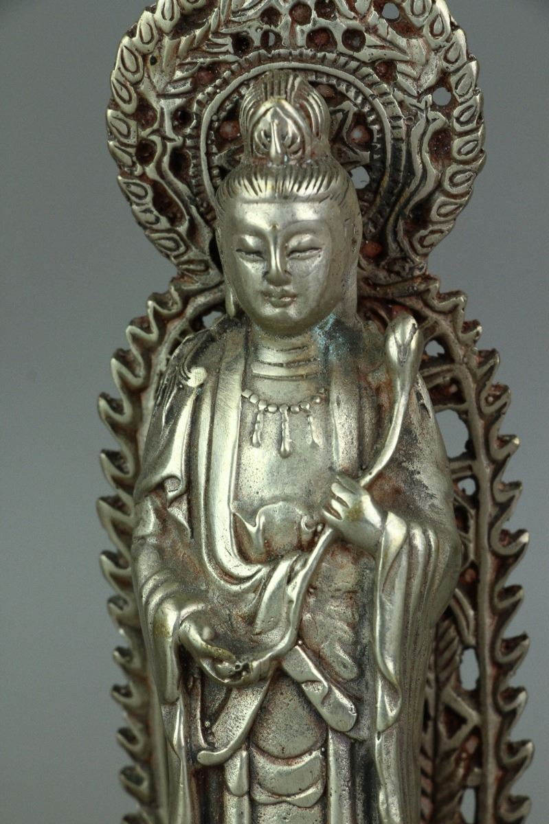 Two Chinese Guanyin and one Buddha statue standing on lotus plinth with carved flaming aureole; one Guanyin holding a ruyi and the other one holding a holy-water bottle; H: 20 cm, W: 6 cm, 452 grams each, silver not tested for purity