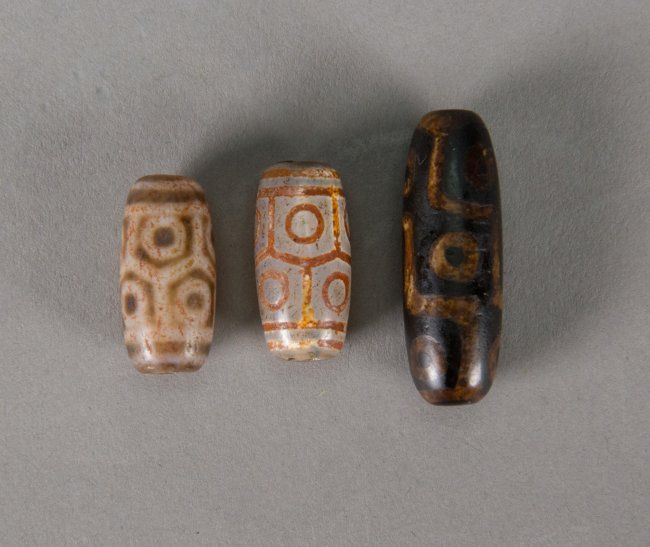 Three pieces Chinese Tianzhu beads; one nine-eyed Tianzhu and two eight-eyed Tianzhu; H: 3.5 cm, W: 1 cm (1), H: 2.2 cm, W: 1 cm (2,3), 26 grams total