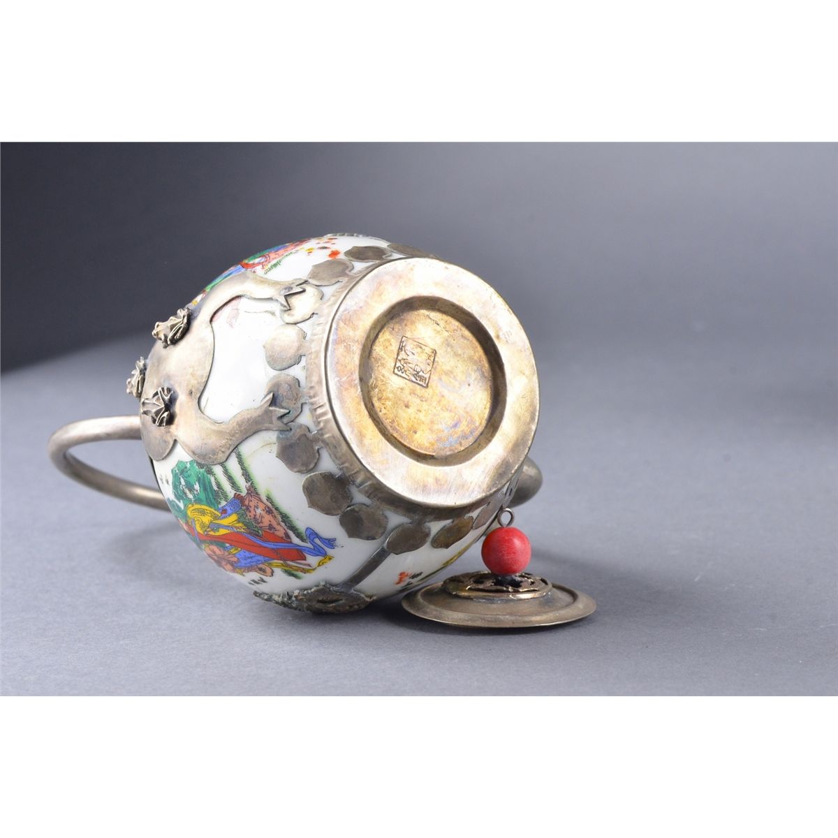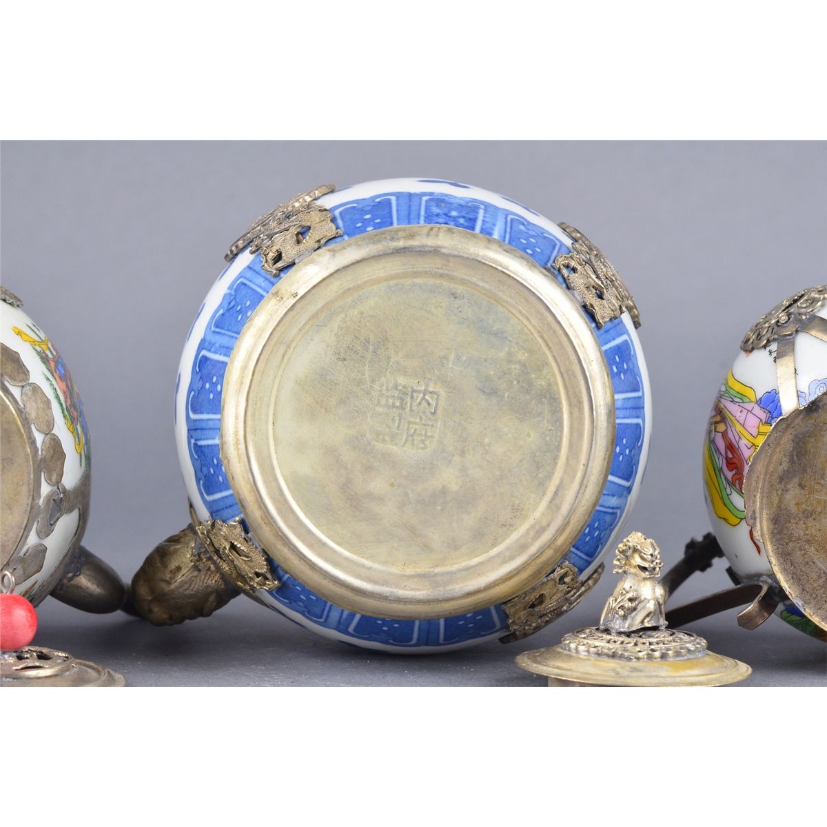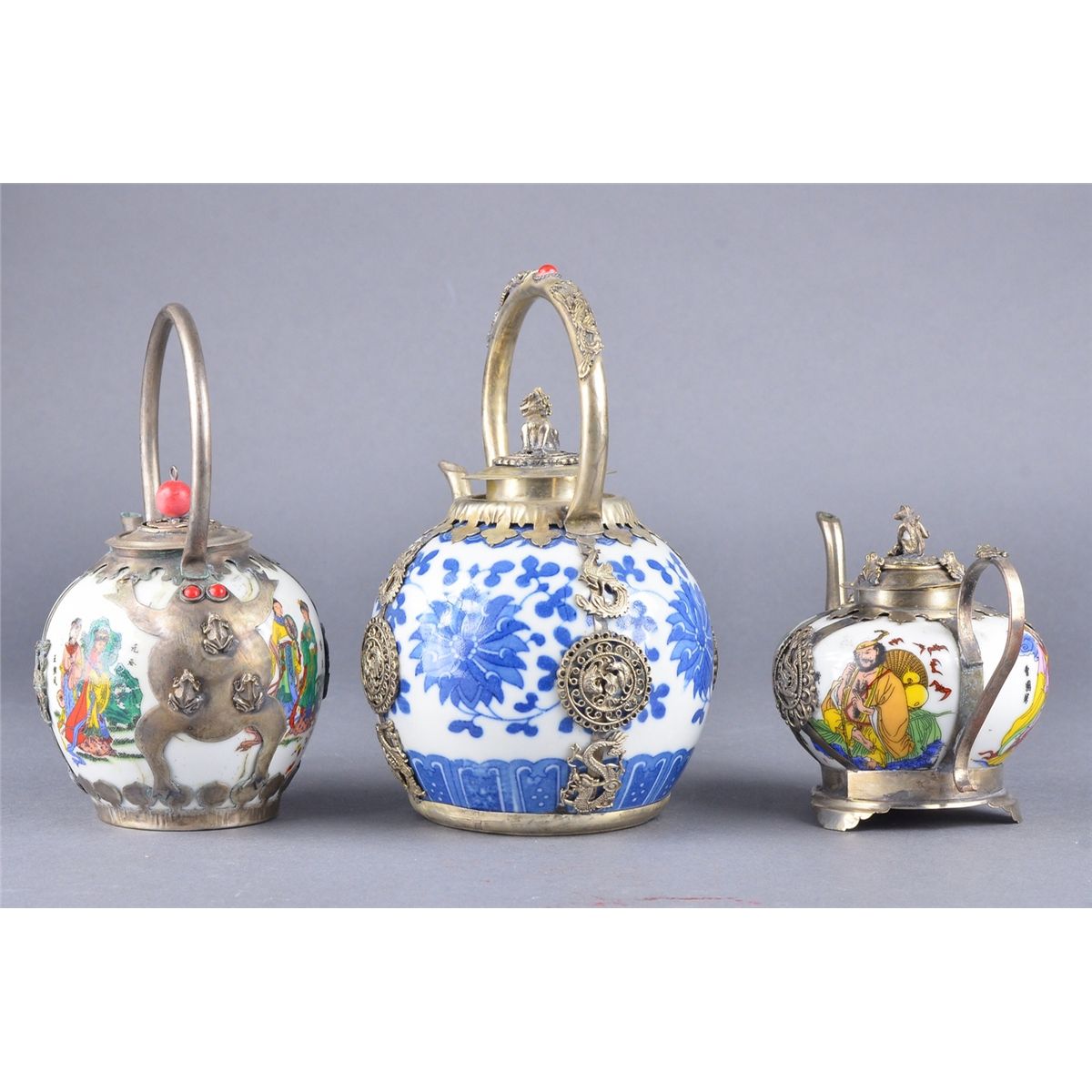 Set of three Chinese Tibetan silver tea pots; L: 15 cm, H: 10 cm, W: 9 cm (1); H: 17 cm, L: 13 cm, W: 9 cm (2); H: 18 cm, L: 15 cm, W: 10 cm (3)