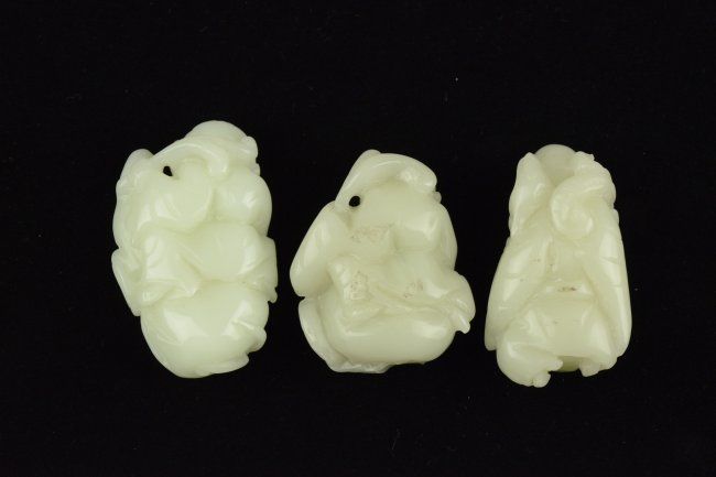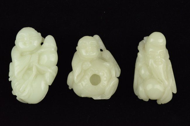 Three pieces of finely carved white jade, depicting a laughing Buddha holding double gourd, another holding a vase and Shou Lou holding a double gourd, the stone of white tone; H: 6.5 cm, W: 4 cm, total 184 grams.