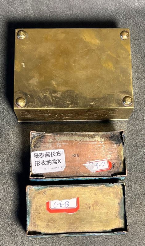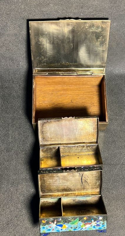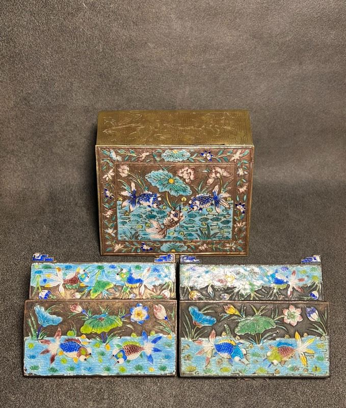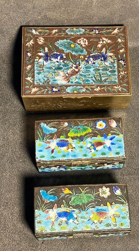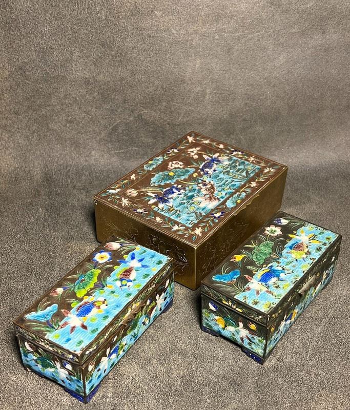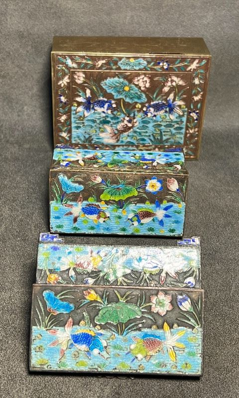 This set of three rectangular boxes is crafted with copper bodies and decorated in cloisonné enamel, featuring fish swimming among aquatic plants and lotus leaves. The lively fish, rendered in bright colors, symbolize abundance and prosperity. The turquoise and green grounds evoke flowing water, enhancing the naturalistic effect. Comprising one larger box and two smaller ones, this complete set showcases refined craftsmanship and serves as both functional containers and decorative collectibles.