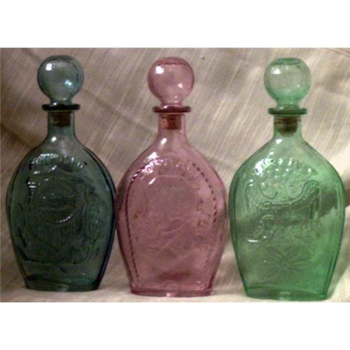 Set of three depression glass decanter bottles. Blue bottle is marked Friendship. Green is marked Liberty. Pink is marked Courage. All three is great condition. No chips or scratches. All come with glass stoppers