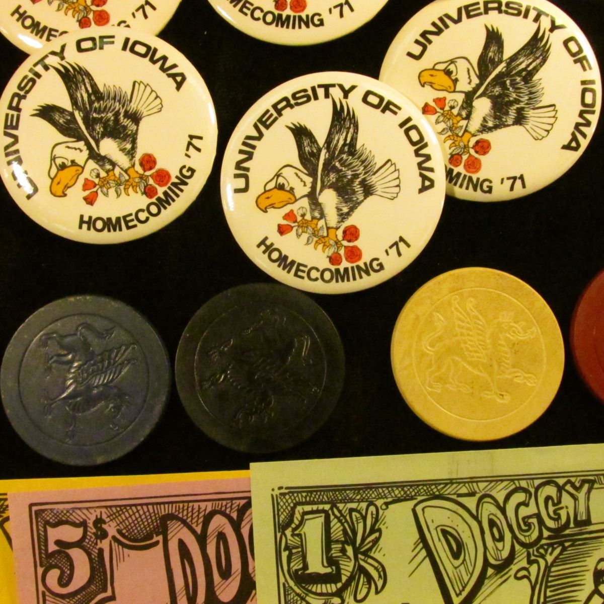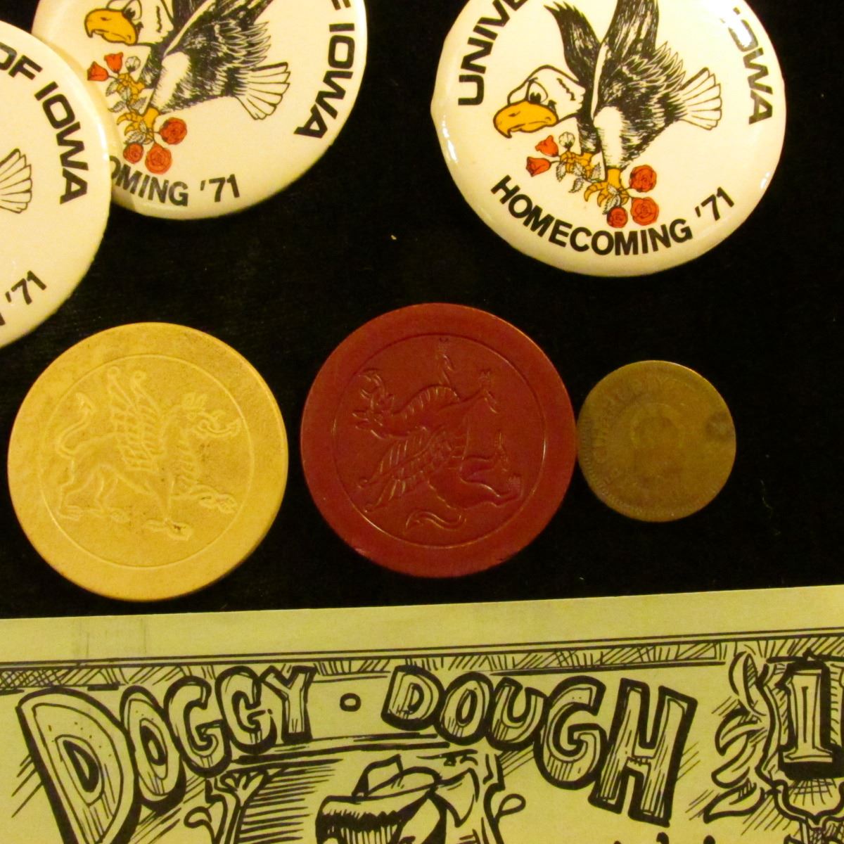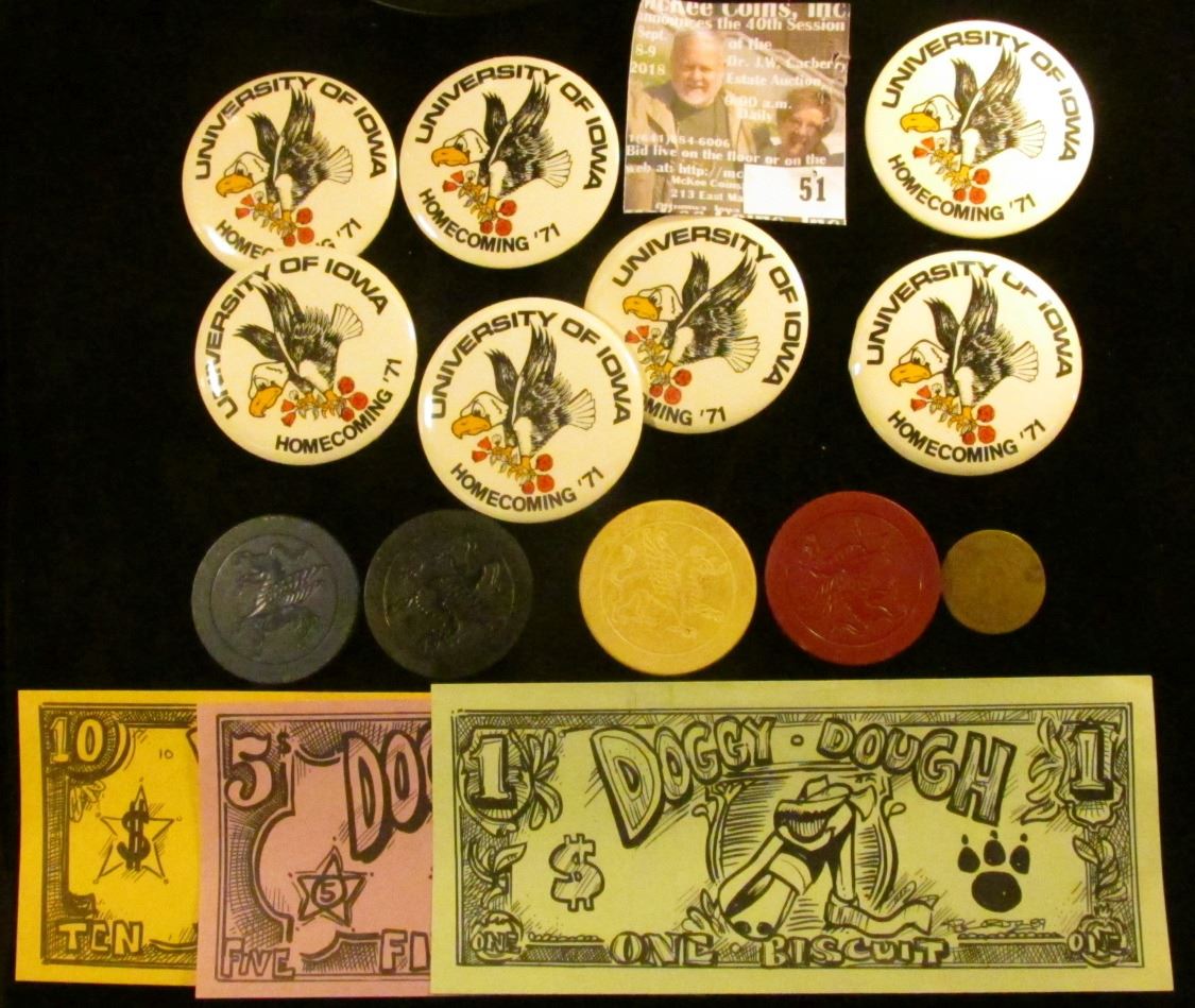 Set of Three "Doggy-Dough" 1, 5, & 10 Biscuit Notes. This Doggy Money was used at Wichita Grey Hound Race Track in Wichita, Kansas, (3) Clay Poker Chips; & (7) University of Iowa Homecoming Pin backs.