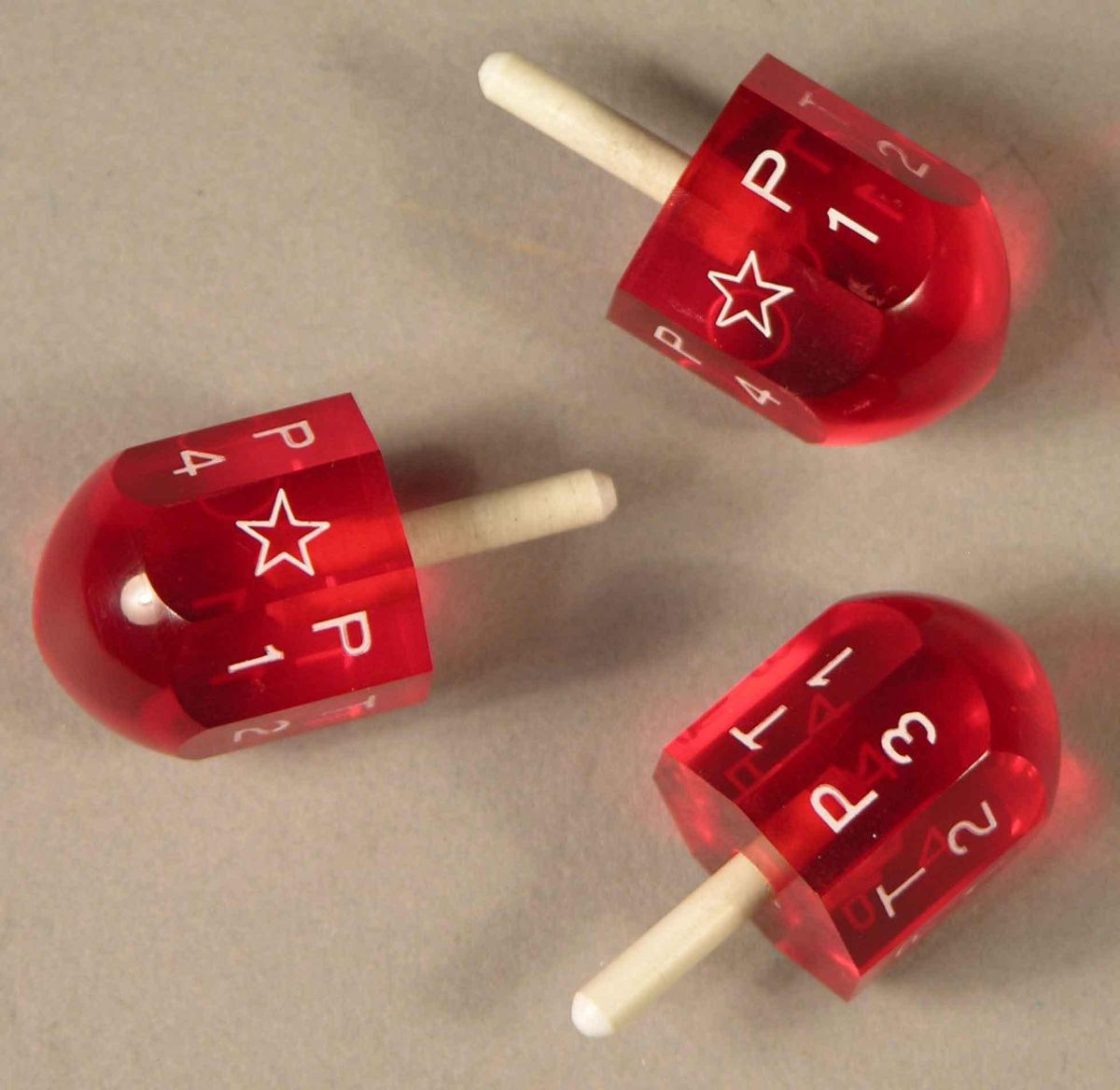 Set of Three Gaffed (Cheating) Put-in-Take Spinners. When spun clockwise favors the house, when spun counter clockwise favors the gambler. Translucent red in color. Excellent condition. 1 1/4 inches each including the handle.