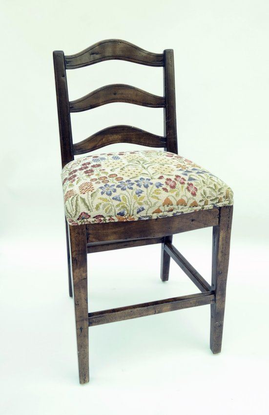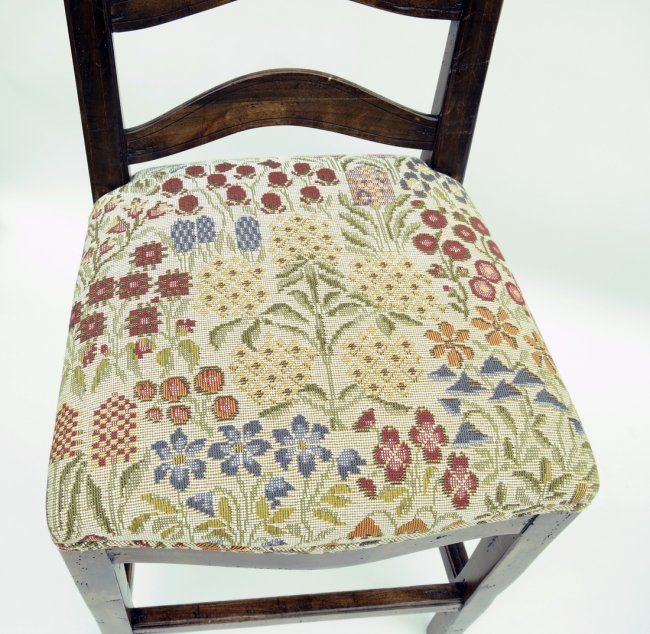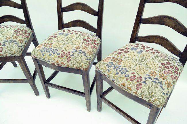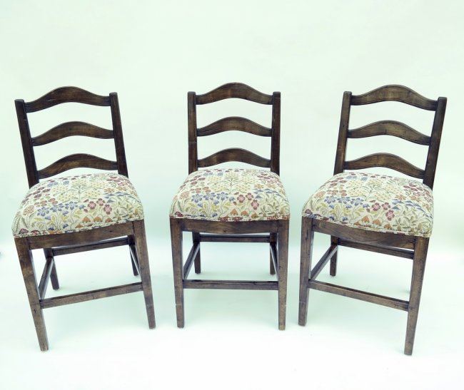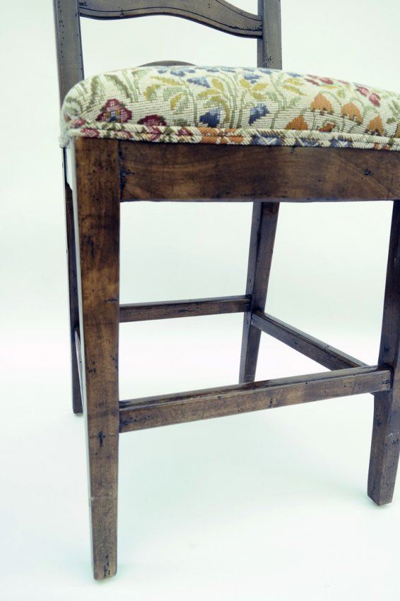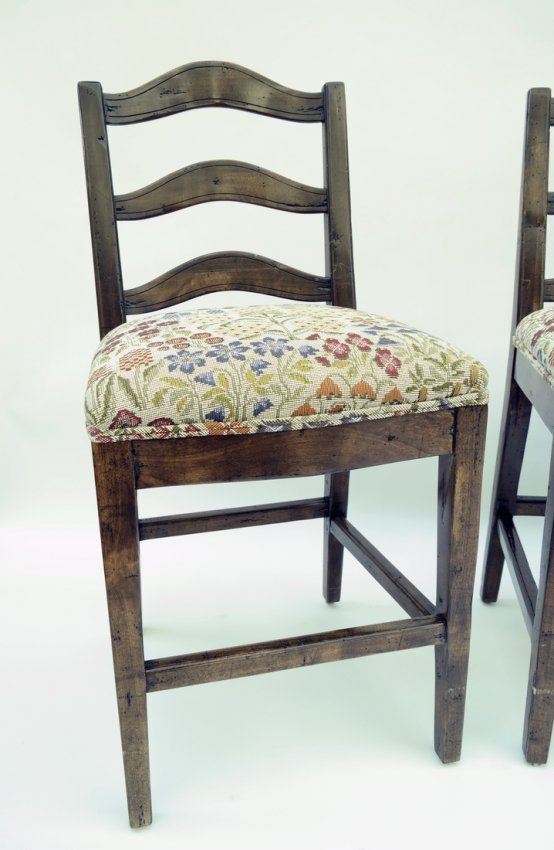 Stained pine frames with upholstered brocade upholstery. [17" W x 18" D x 38" H; 24" H to seat]. In good condition with minimal scratches.