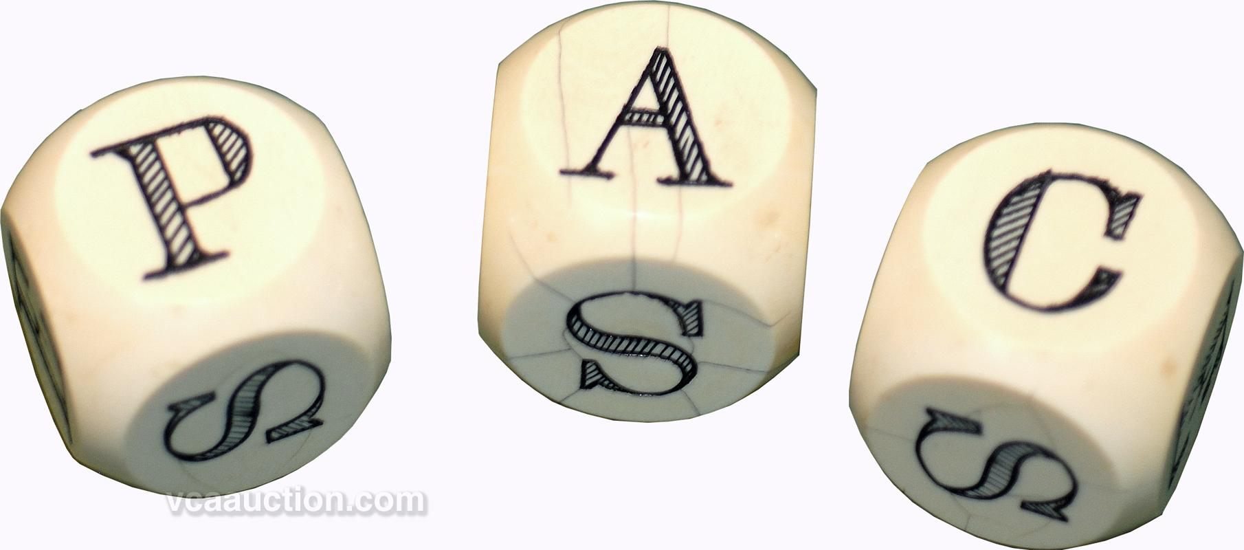 Set of Three Large, Mutual Pool, Ivory Ball Dice - Three 1 5/16" ivory ball dice scrimshawed with the letters: P-A-C-E-R-S. representing the first letter in the names of horses: Pilot, Arab, Canada, Eclipse, Rover and Saxton. Used for playing Cubic Mutual Pool, these dice can be dated from pre-1900 gambling supply house catalogs. Among the rarest of all collectible dice.