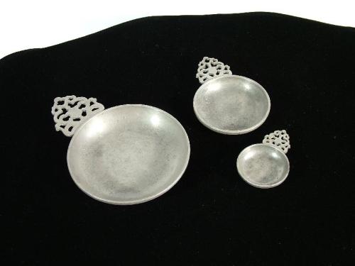 Set of 3 pewter bowls made by "Stede," each with ornate handle on one end. Small: 2 1/2" by 1 1/2" Medium: 4" by 3/4" Large: 6" by 1"