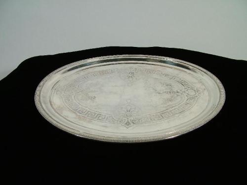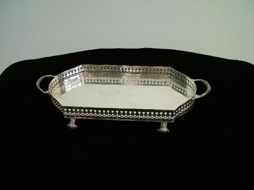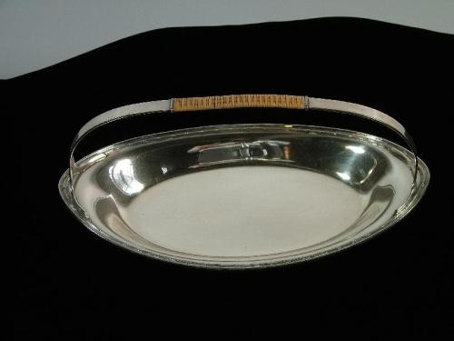 Silver plate oval raised bread tray with basket-style handle, wicker wood at top of handle. Stamped at bottom, "EPNS 231" on bottom, 4 1/2" with handle, 11 3/4" by 6"; Silver plated appetizer tray with carved, raised lid, handles, and carved feet, 2 3/4" by 13 1/2" by 6"; Silver plated serving tray with lineal trim and etched decorative center, 16" by 12 3/4"