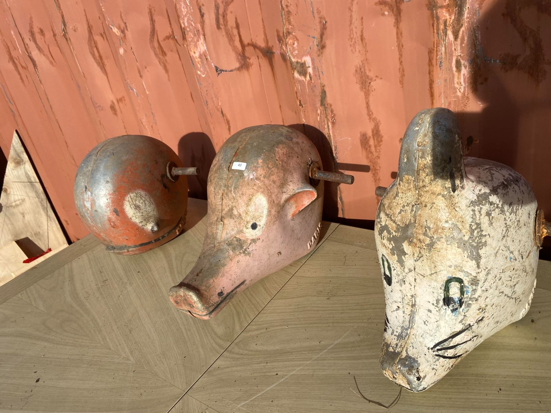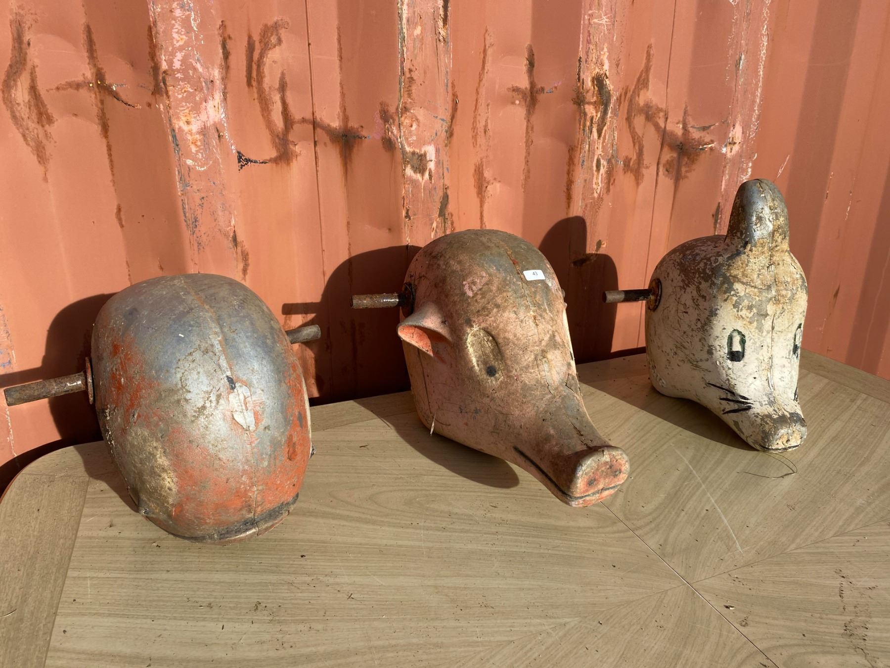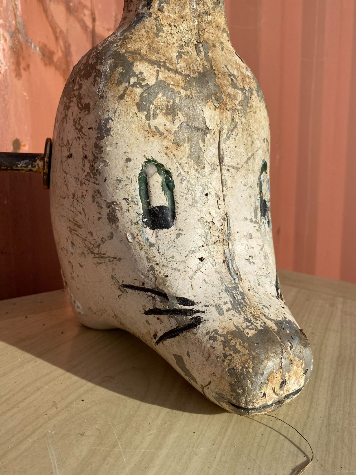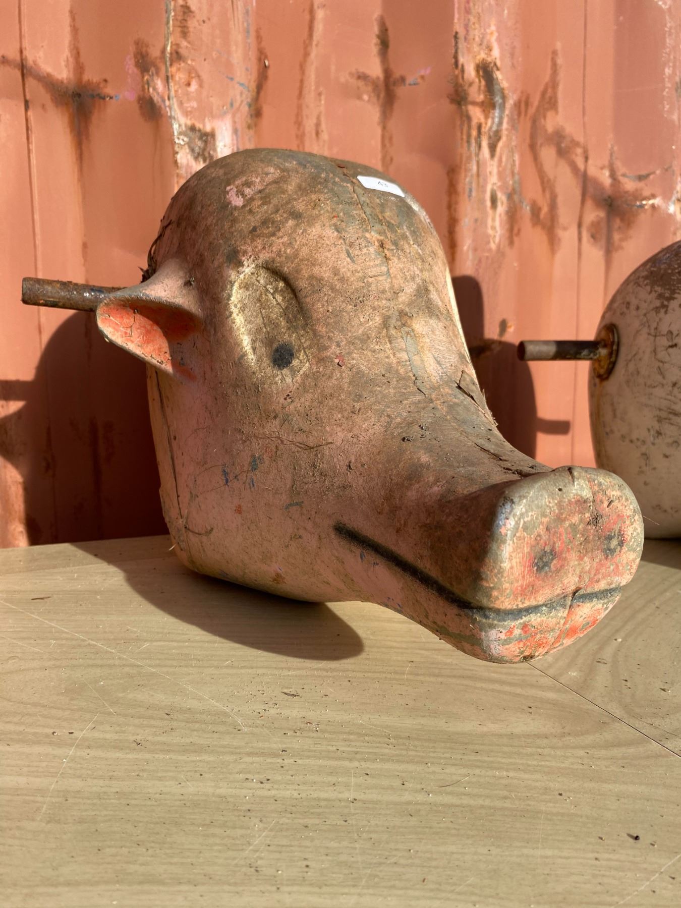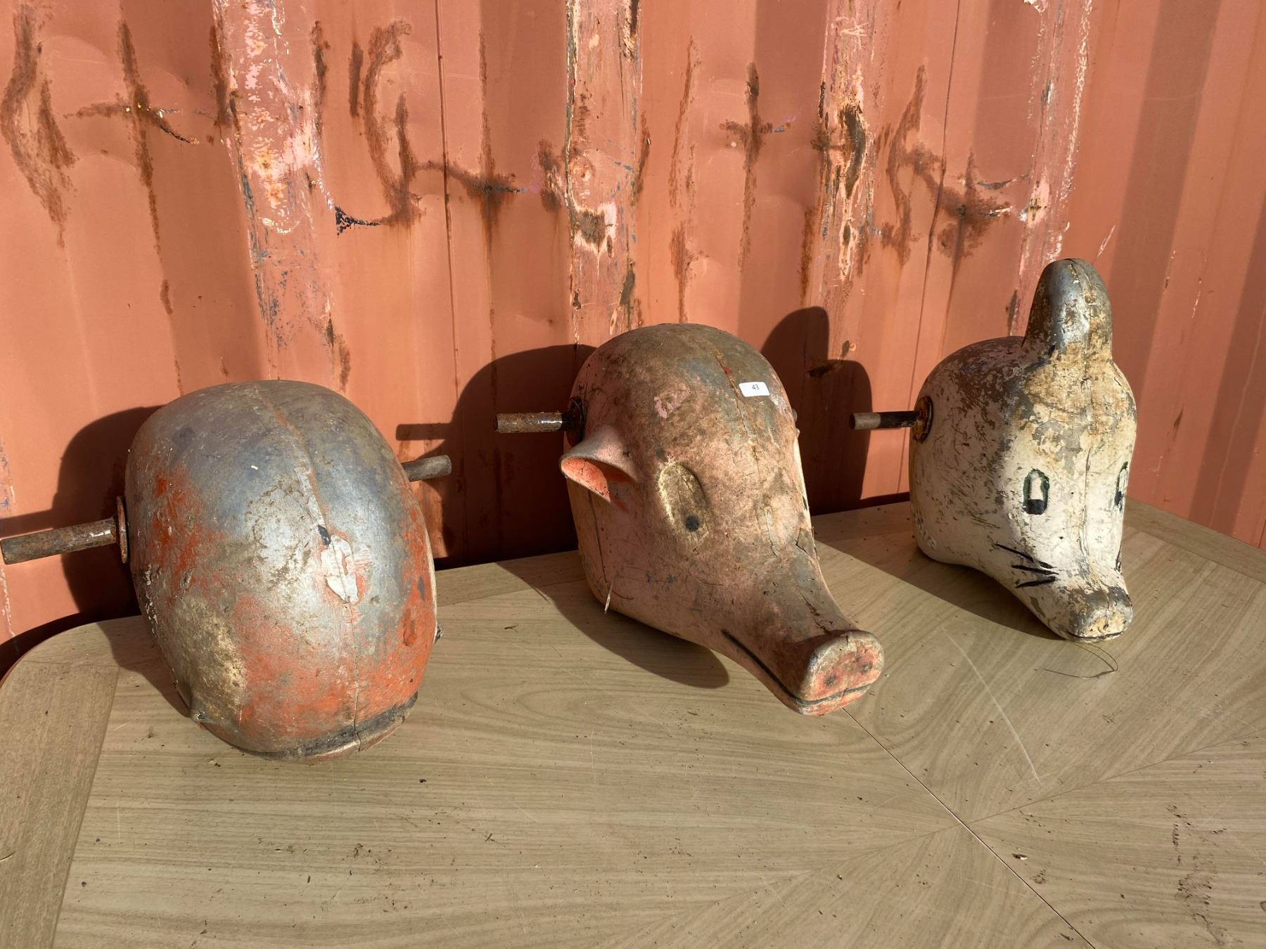 A character-filled trio of vintage carnival ride animal heads, each showing decades of outdoor use that add to their authentic amusement-park charm. These mid-20th-century pieces feature original paint, aged patina, and substantial weathering perfect for collectors, decor designers, or anyone looking for unique vintage statement pieces with true fairground history.