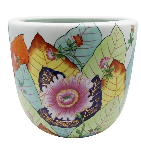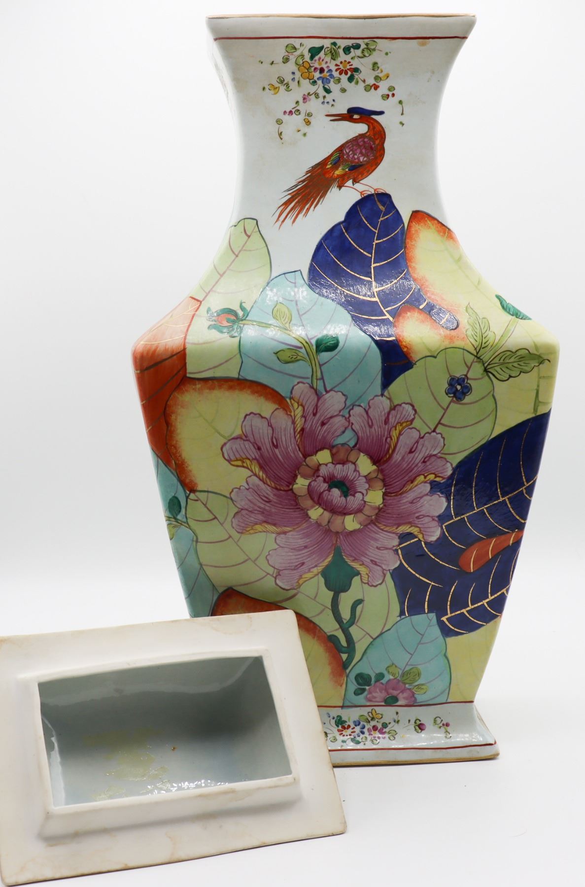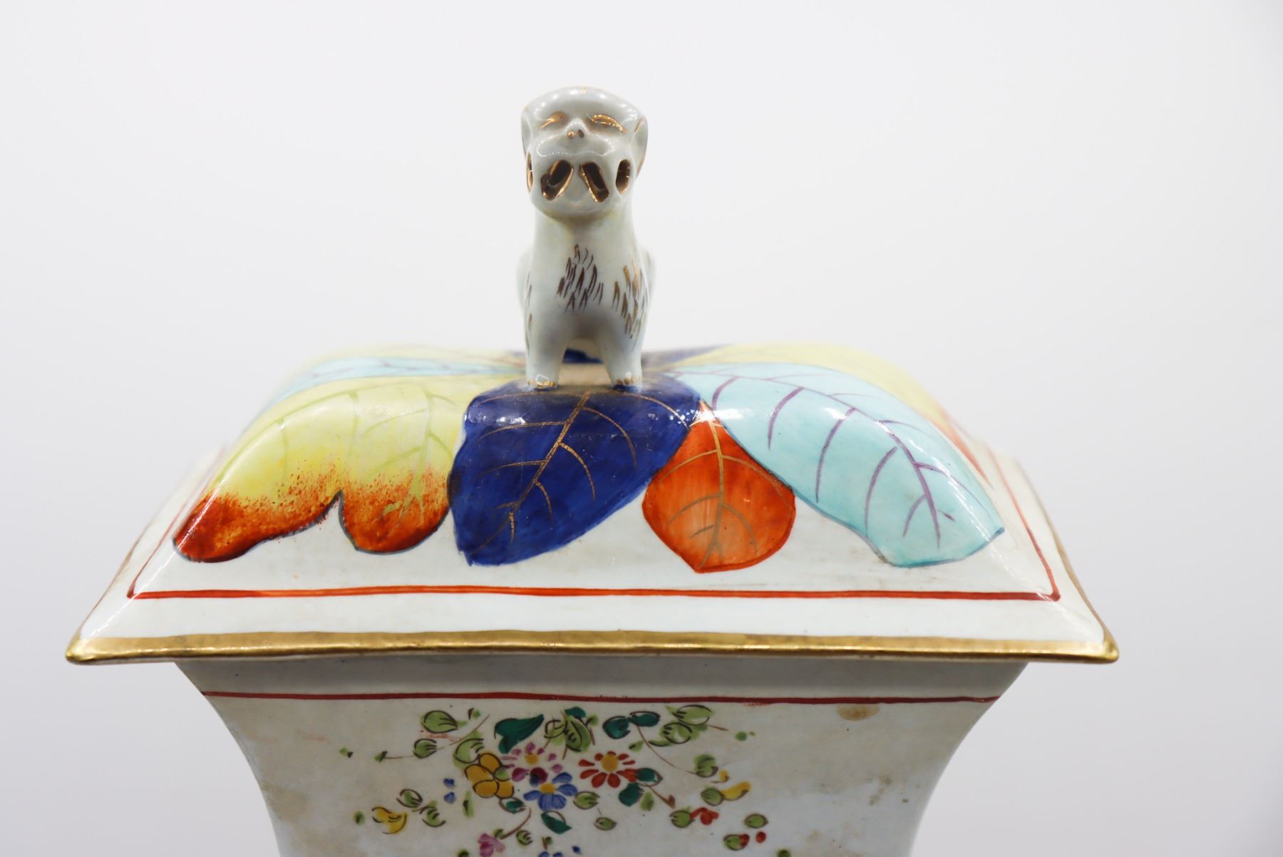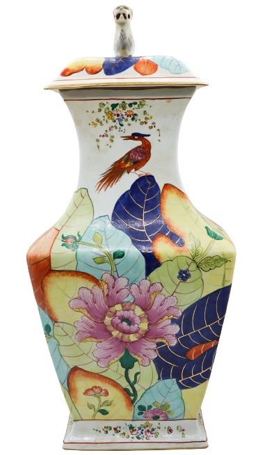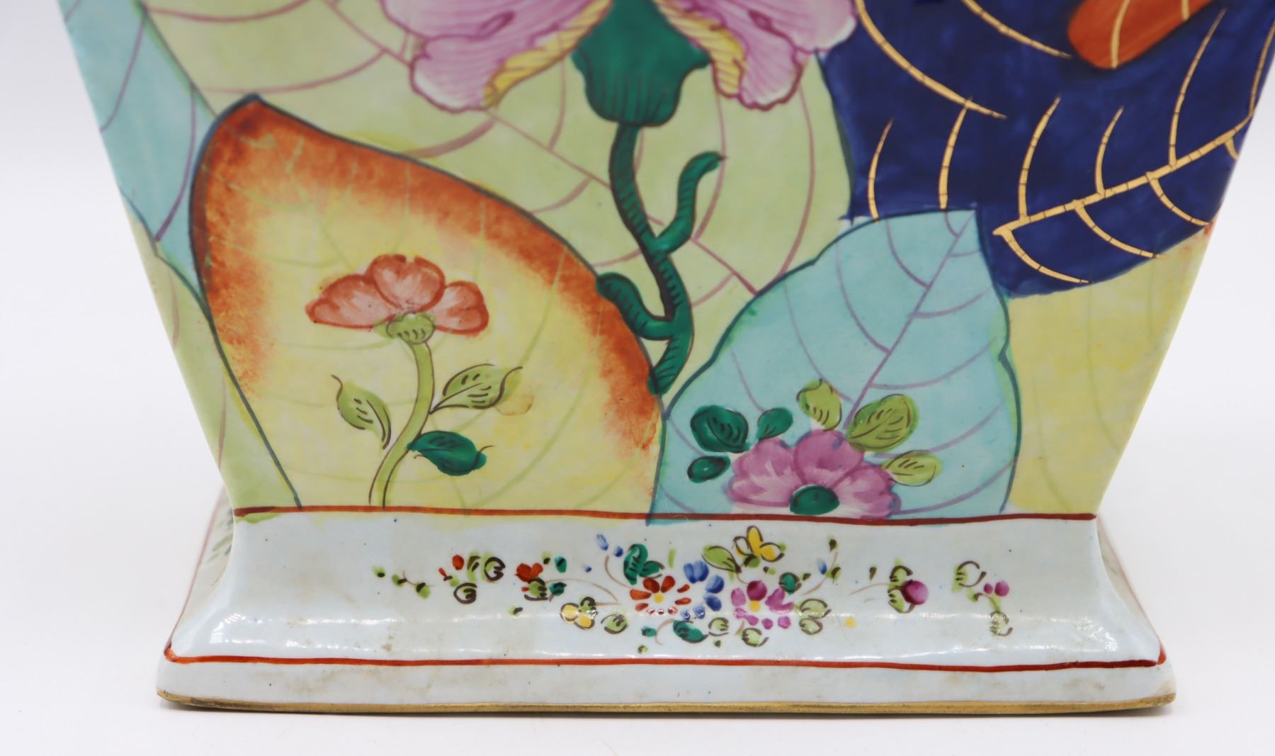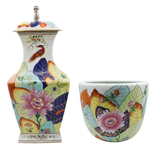 Matching pair of Chinese hand painted floral jar w lid and bowl. Lid has a foo dog on the top.
