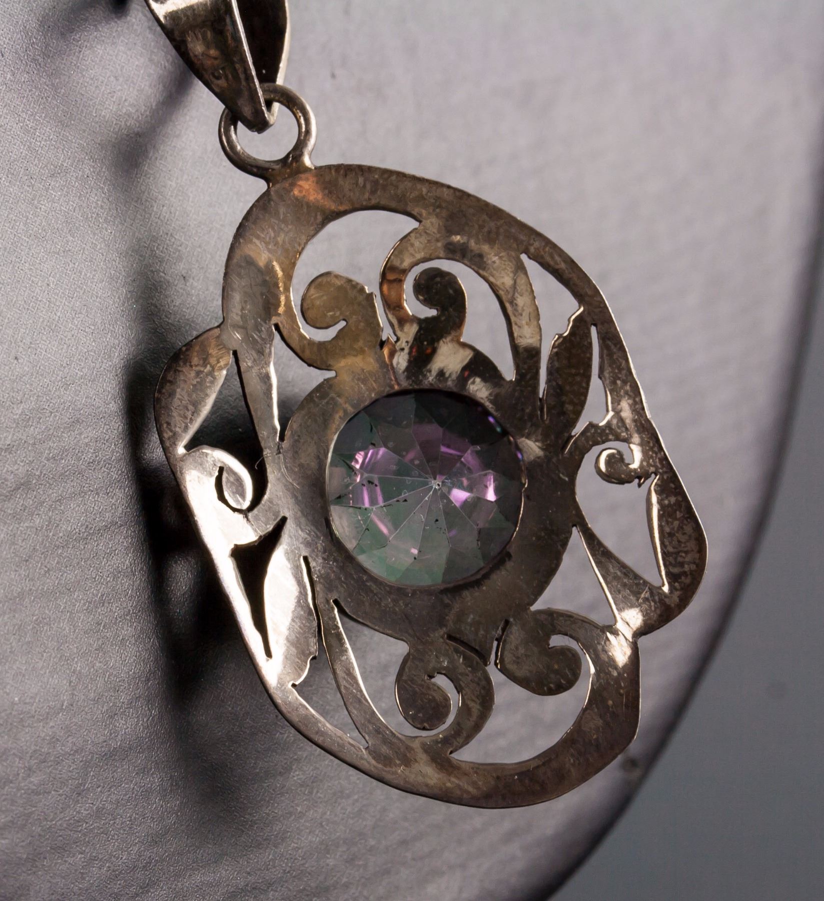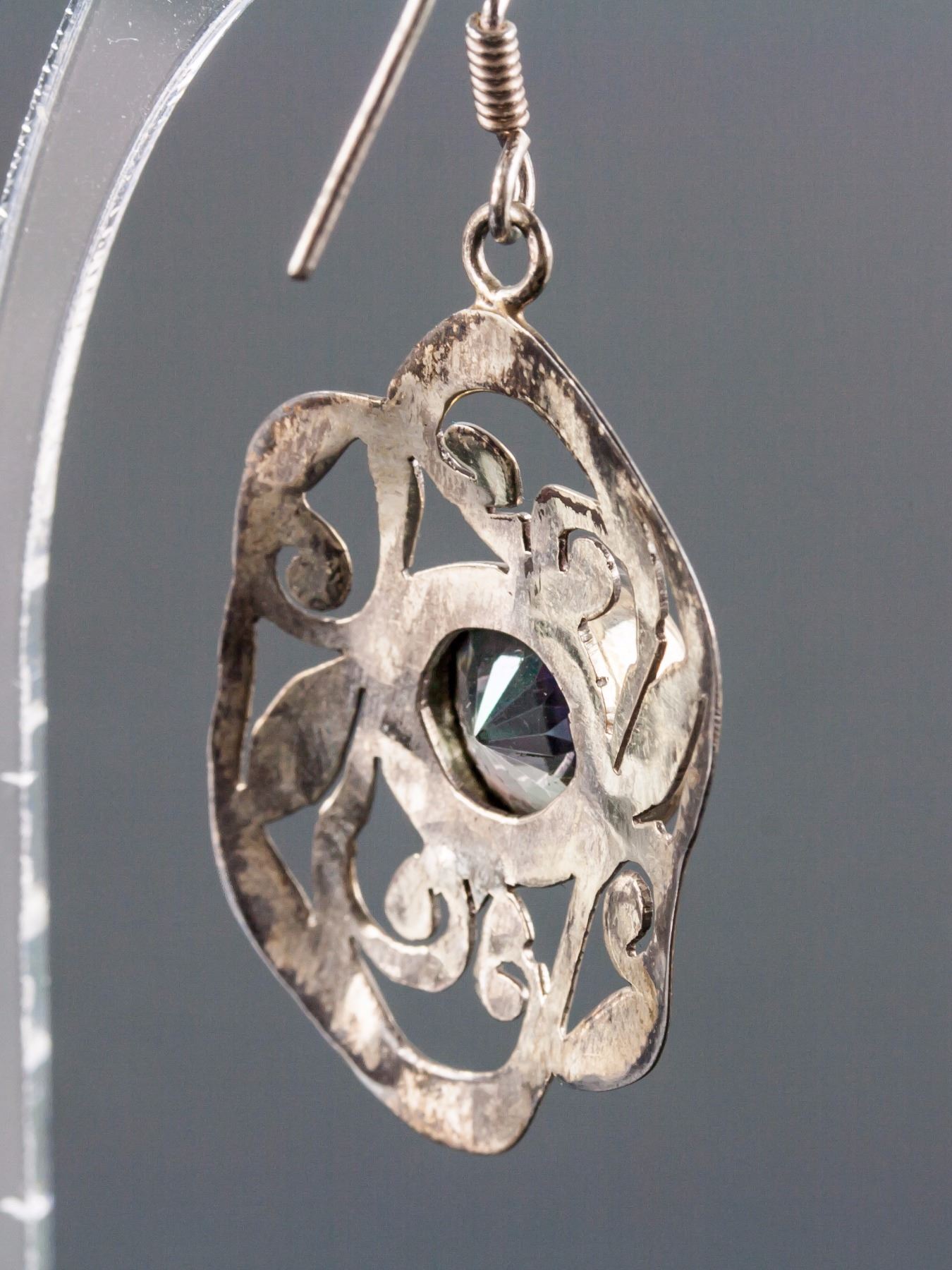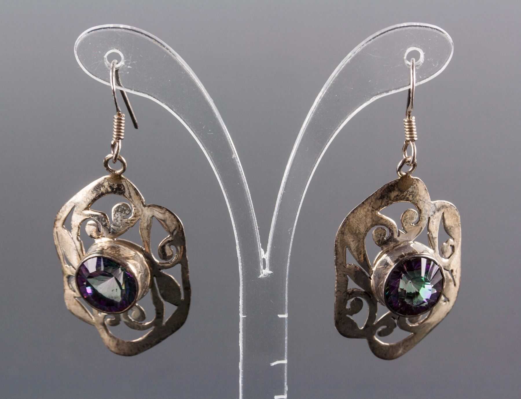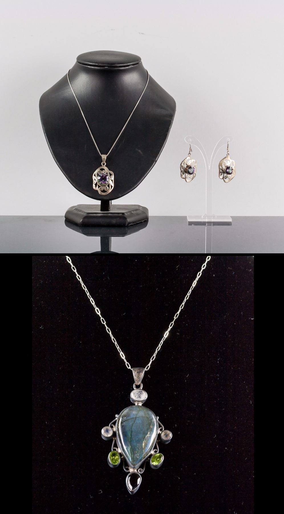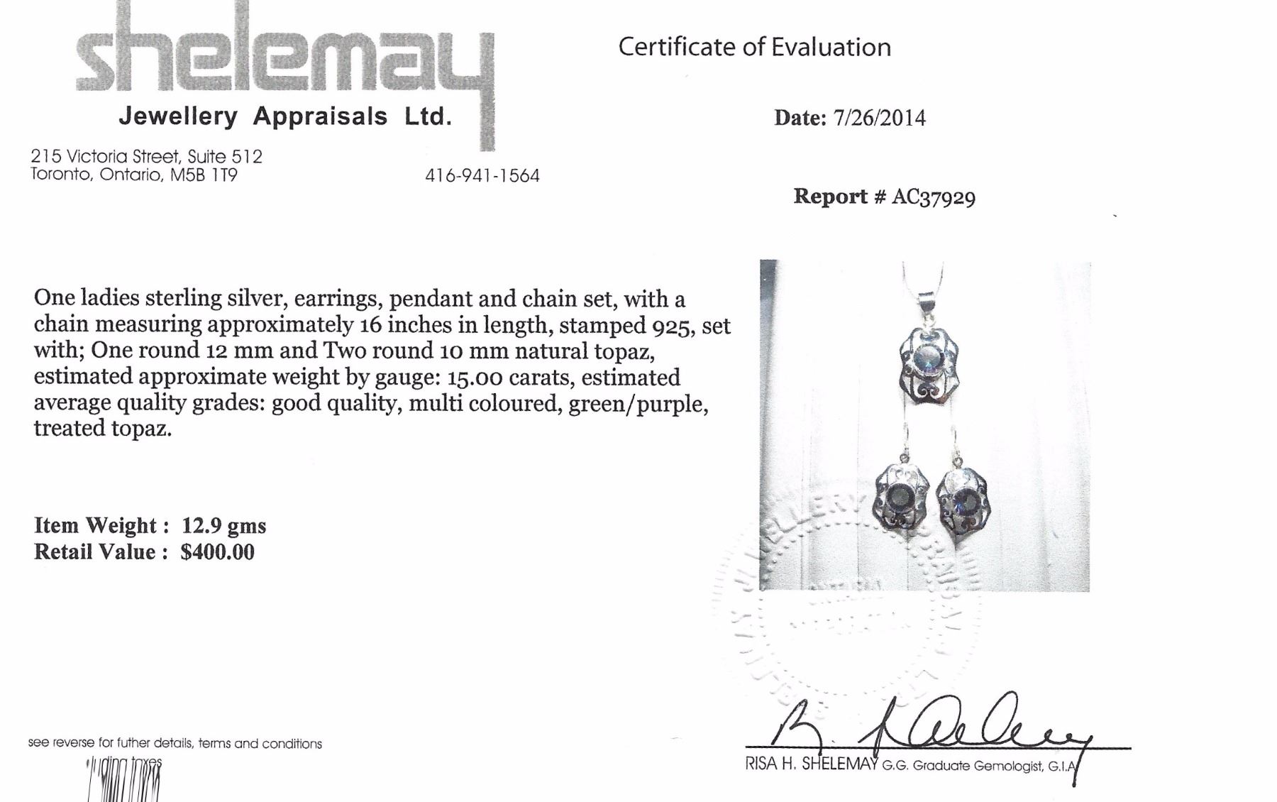 Stamped 925 silver earrings and necklace; set with 15.00ct round natural multi-coloured, green/purple topaz; certified replacement value $400; 12.9 grams