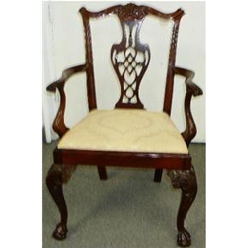 This is a fabulous set of twelve Chippendale style dining chairs consisting of ten sides and two arms. The height to the top of the arm is 27.5 and the height to the top of the seat is 20". The upholstery is usable except for one chair that has a stain from a spill...it may be removable???