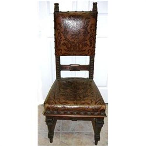 This is a fabulous set of twelve 12 carved wood and embossed brown leather dining chairs from Italy. Ten are in very good condition and two have a bit of damage to the seat area. They have a rich "Old World" look with great patina. The perfect choice for the finest dining room!