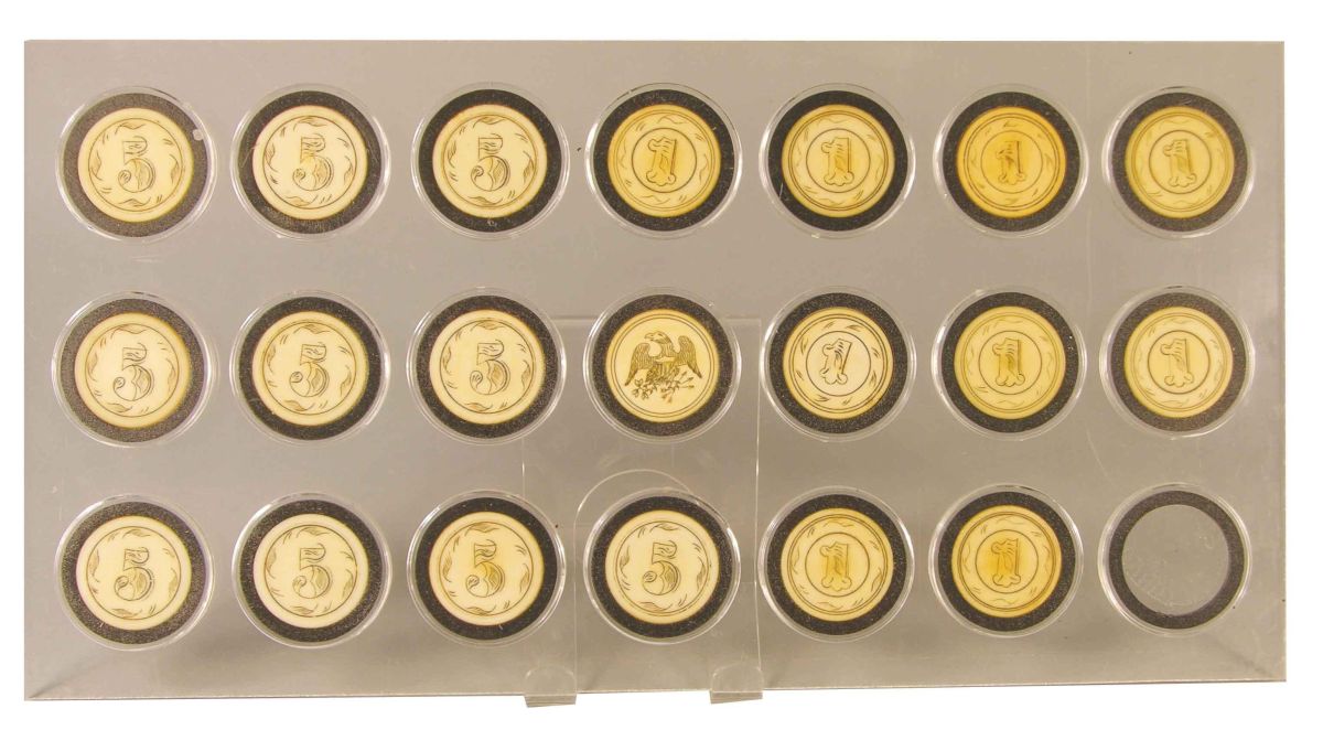 Set of Twenty Ivory Poker Chips. $1, $5 and Eagle motif. Very good to excellent condition.