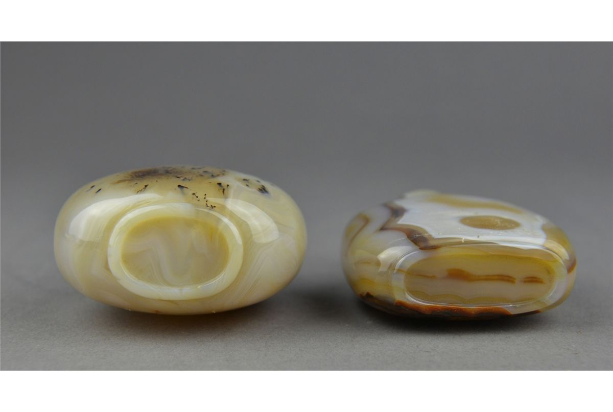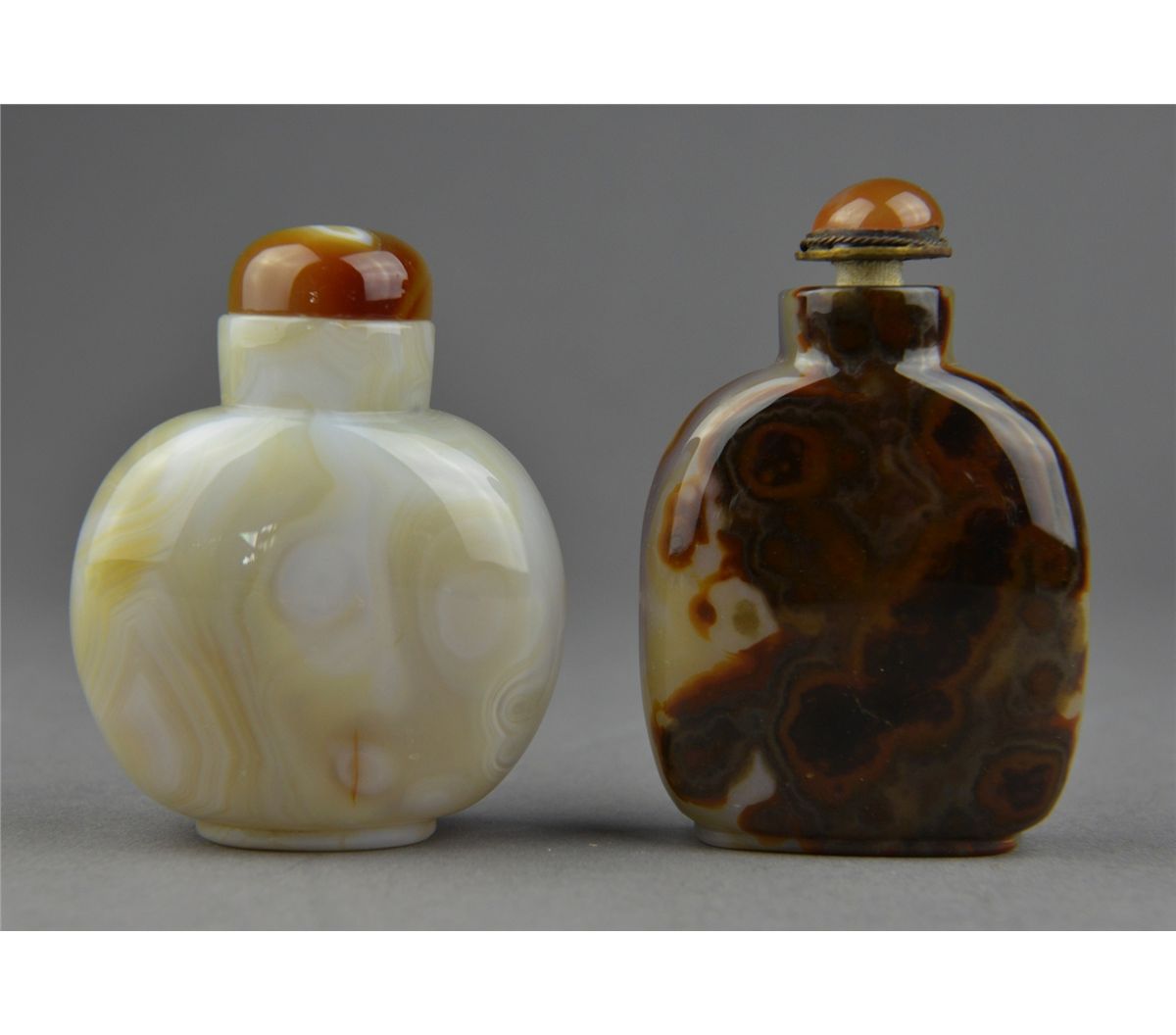 Set of two Chinese carved agate snuff bottles; supported on short foot rim and both possessing matching stoppers; H: 7.5 cm, 59 grams, H: 7 cm, 80 grams. Provenance: Liao Collection Vancouver