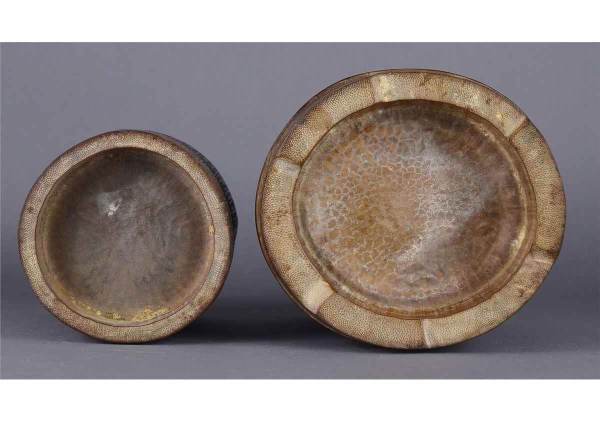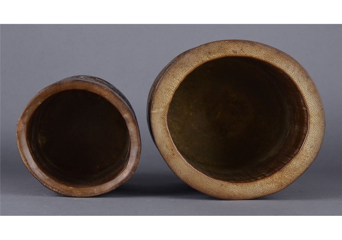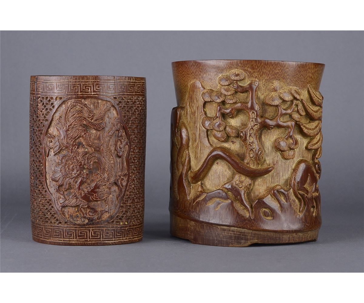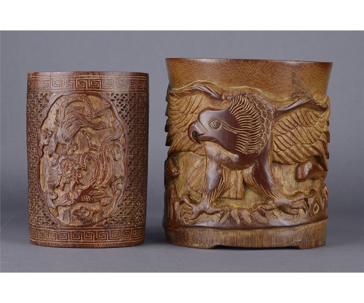 Set of two Chinese carved bamboo brush pots; first small brush pot featuring reticulated design with phoenix in relief within foliate-shape cartouche; larger brush pot featuring eagle in relief; H: 13 cm, D: 9 cm, 216 grams (reticulated brush pot); H: 14 cm, D: 13 cm, 353 grams (larger brush pot)
