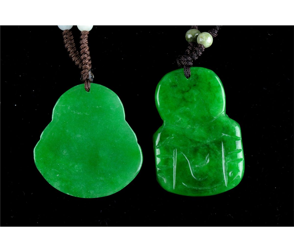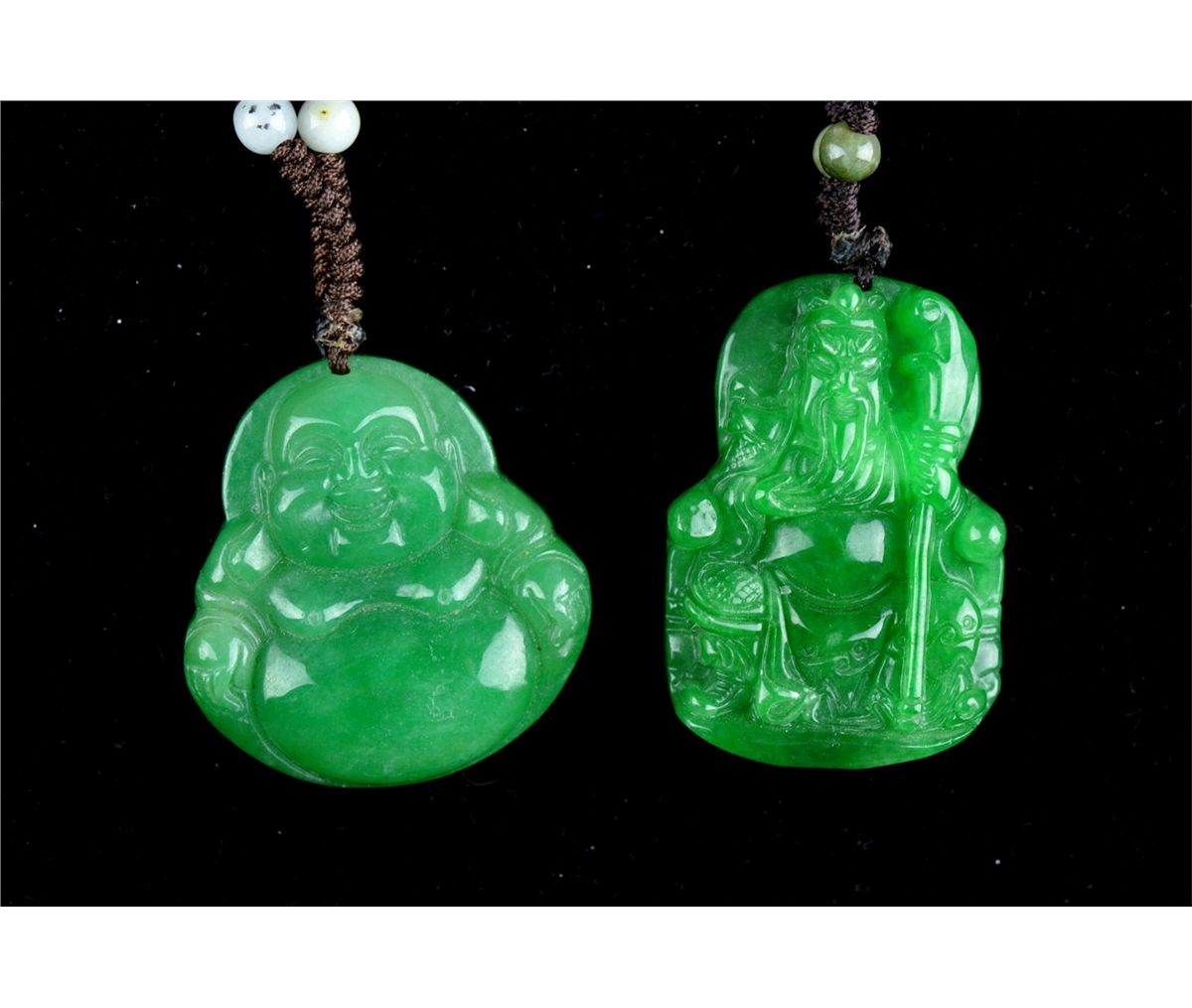 Set of two Chinese carved jade pendants; one of Laughing Budai and the other featuring General Guan Gong; the stone of translucent green tone; L: 4 cm, 68 grams (Budai pendant); L: 5 cm, 68 grams (Guan Gong pendant)