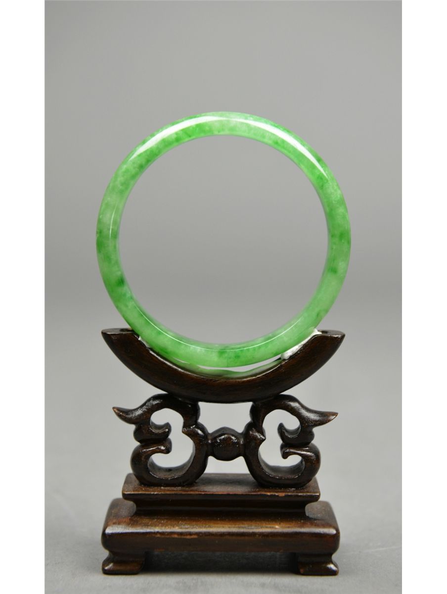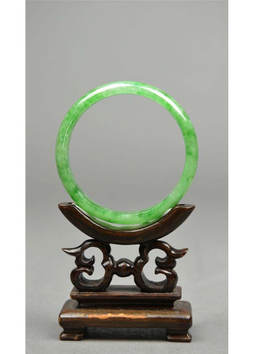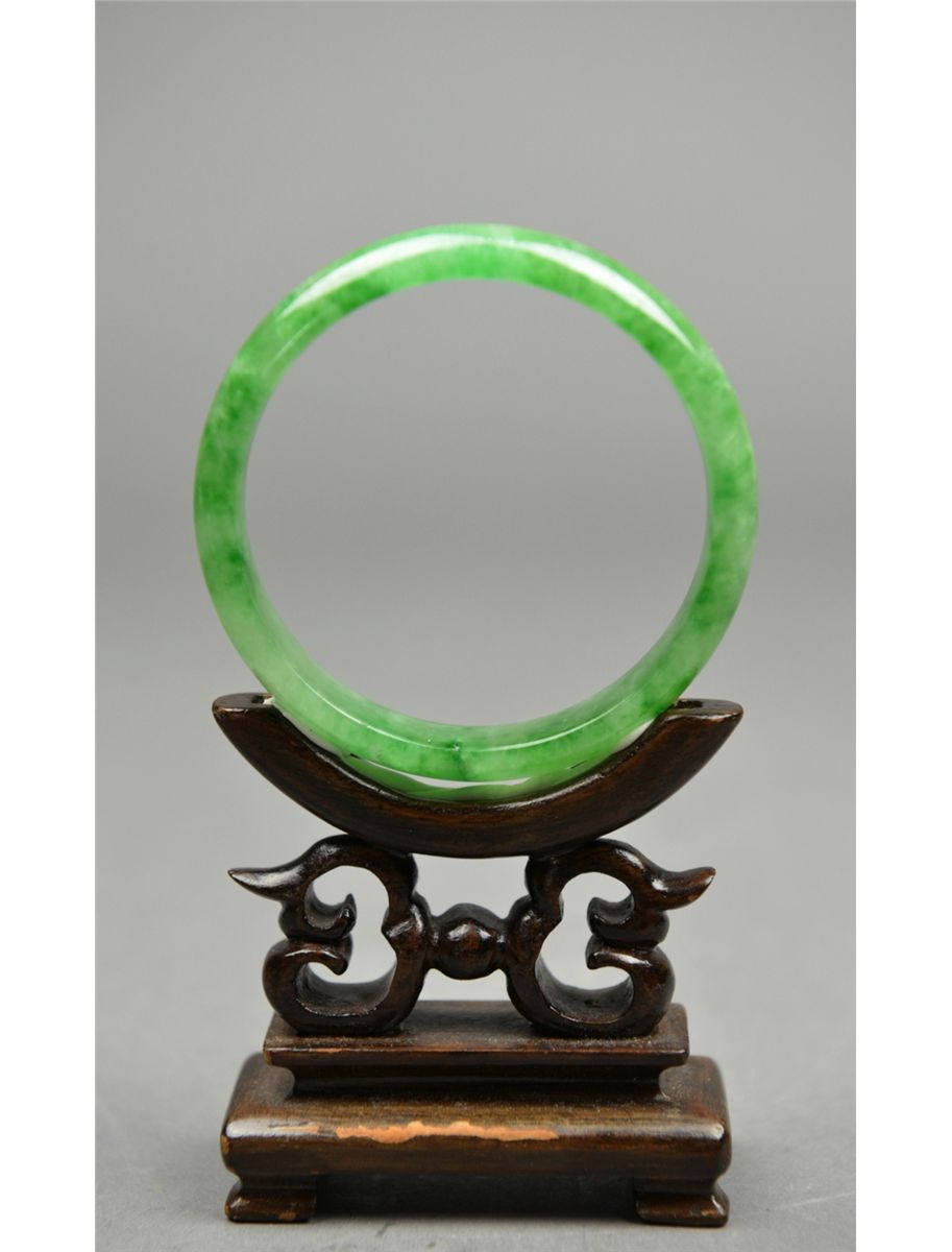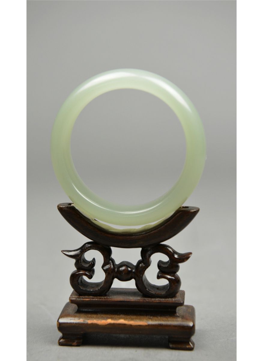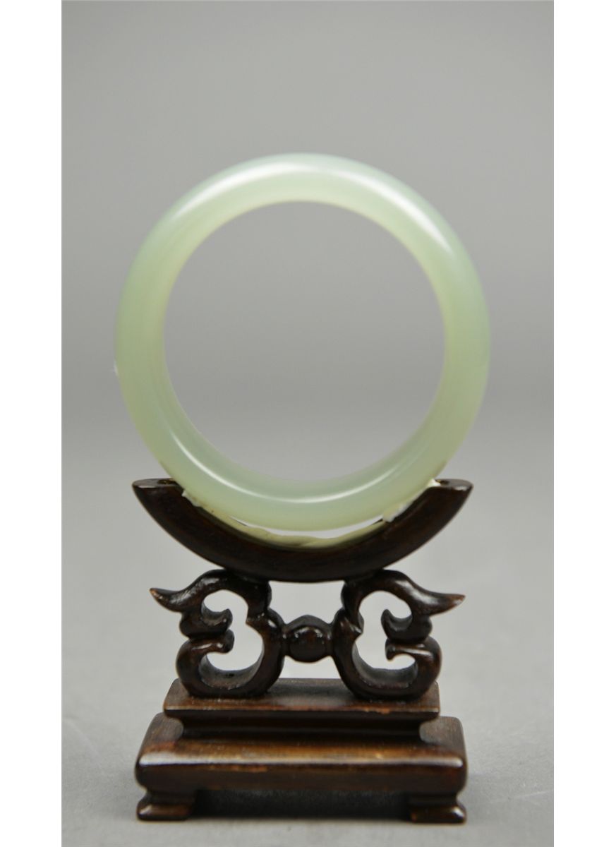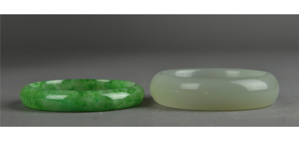 Set of two Chinese carved jade bangles; the stone of translucent white and green tone (stand not included); D: 7.5 cm, 72 grams (1); D: 7.25 cm, 43 grams (2)