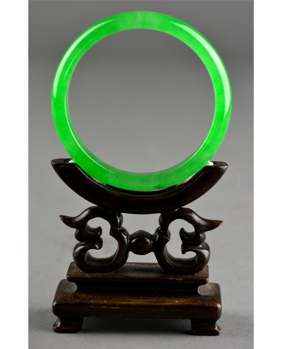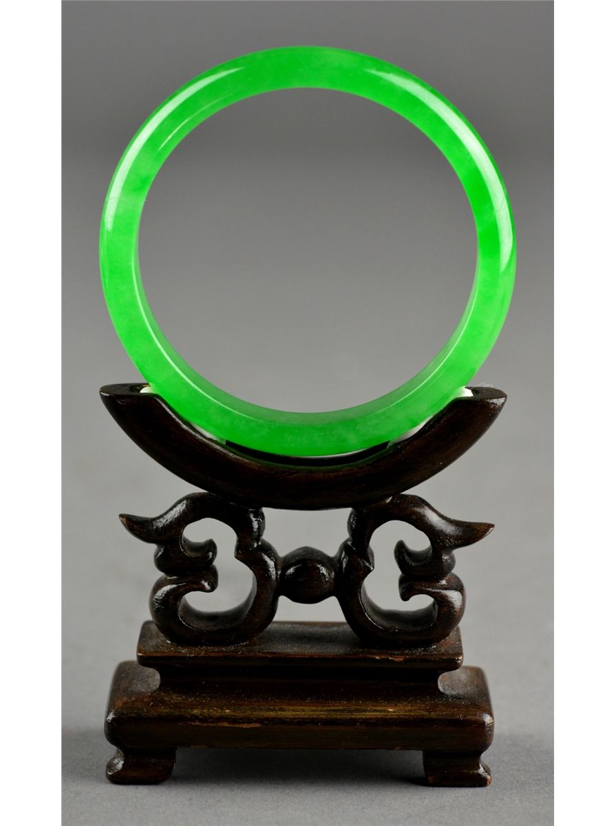Set of two Chinese carved jade bangles; the stone of translucent green and dark green tone; D: 7.25 cm, 37 grams (green bangle); D: 7.5 cm, 50 grams (dark green bangle)