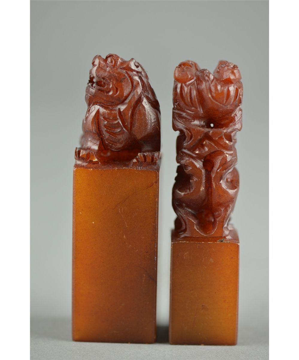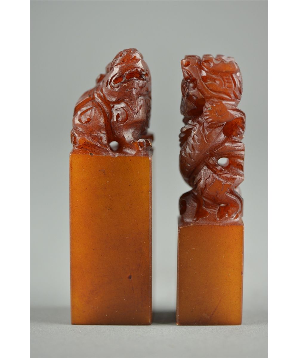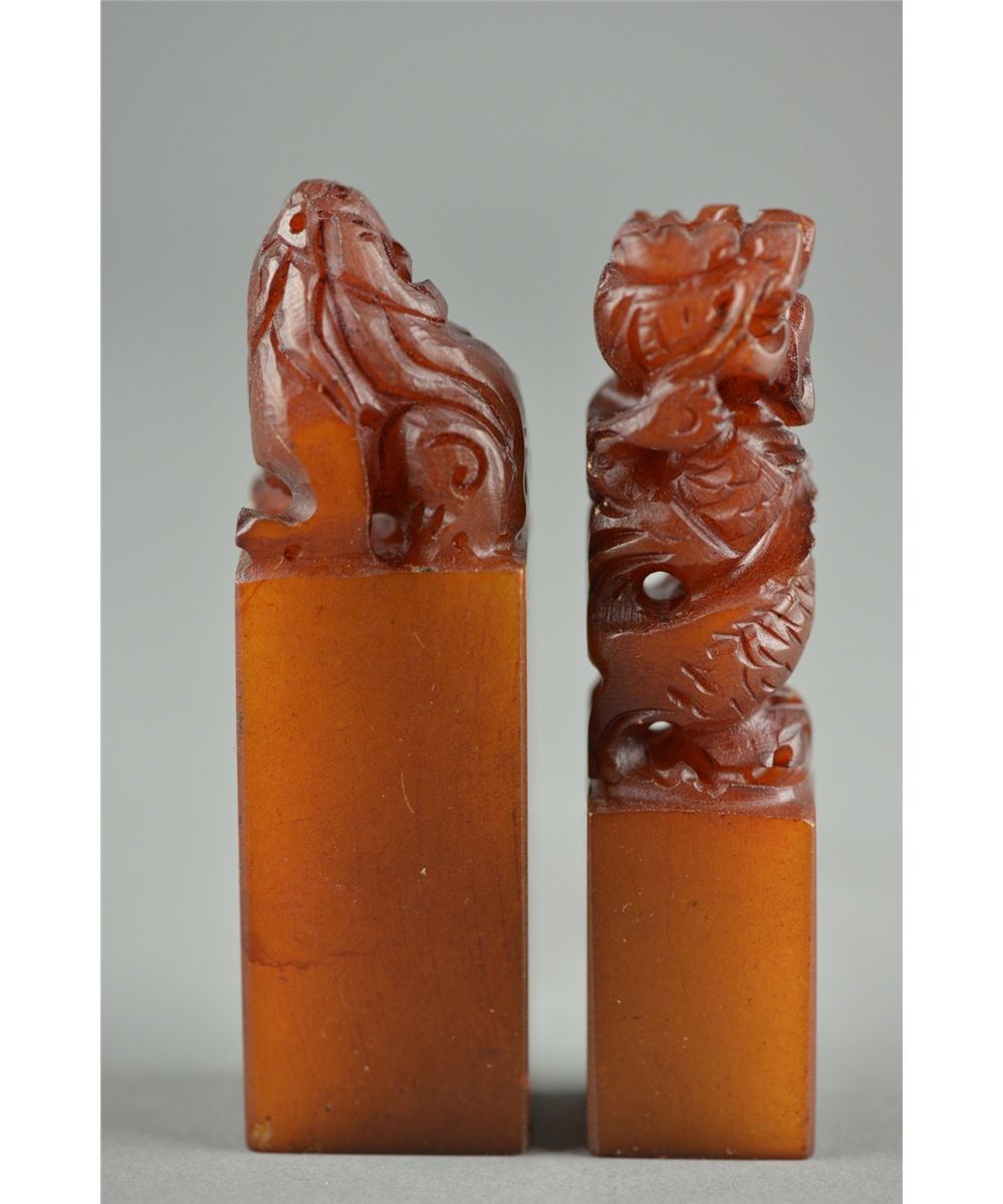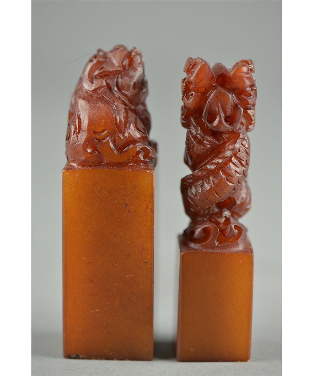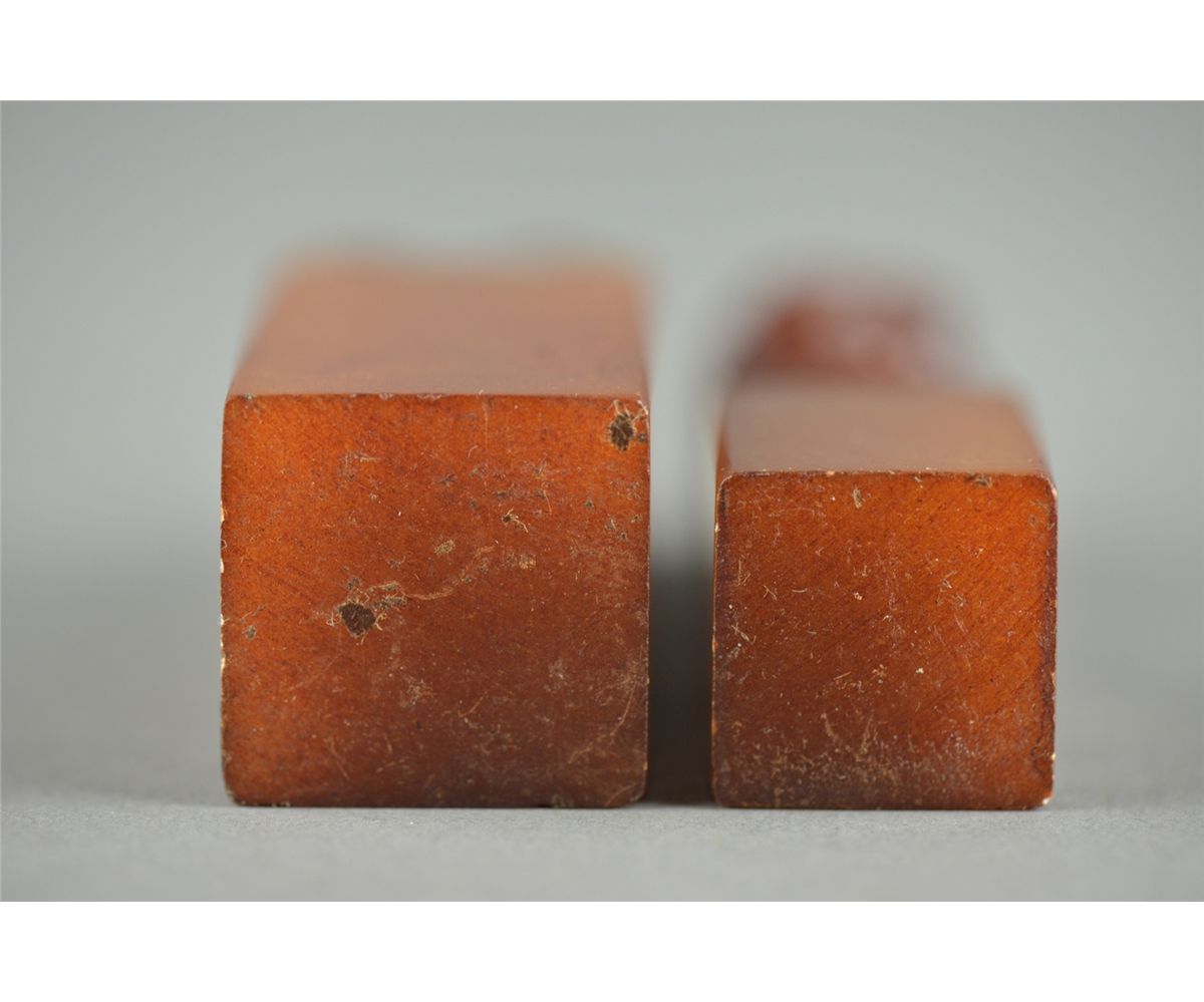 Set of two Chinese carved shoushan stone seals; rectangular form surmounted by dragon in relief; the stone of dark chestnut tone L: 2 cm, W: 2 cm, H: 8 cm(smaller); L: 2.5 cm, W: 2.5 cm, H: 8.25 cm (larger)