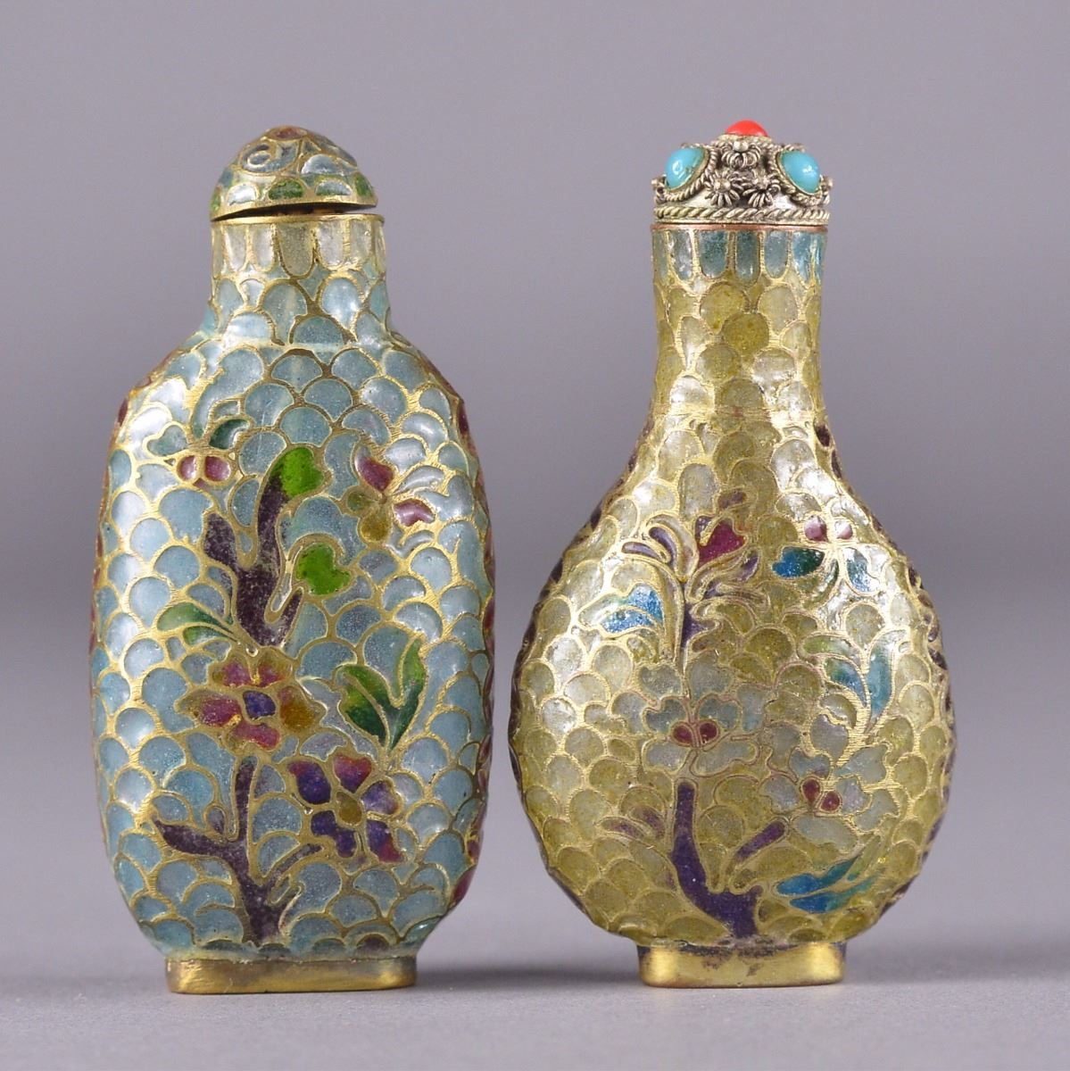 Set of two Chinese glass snuff bottle; featuring inlaid wire design; H: 7.25 cm (approx.)