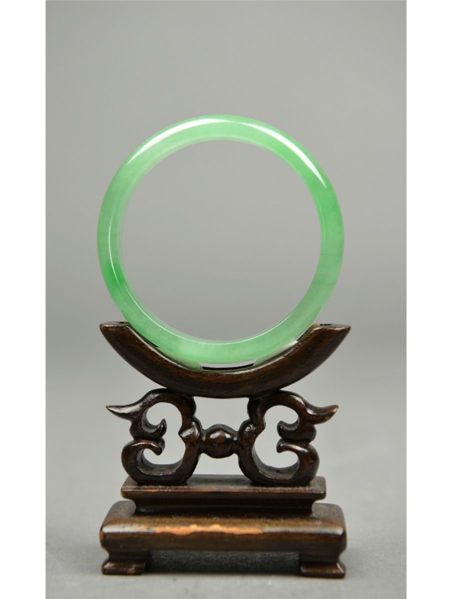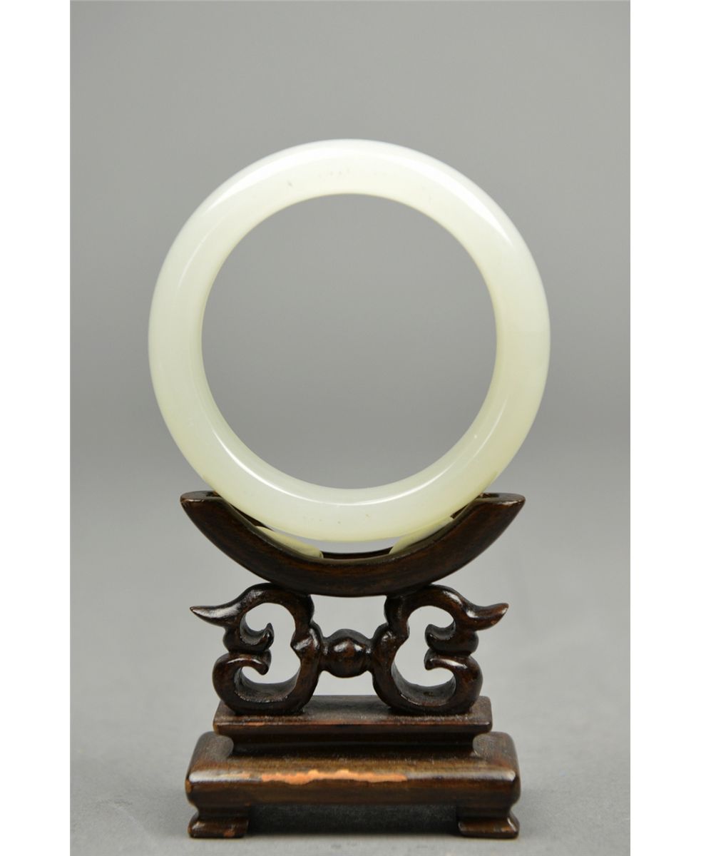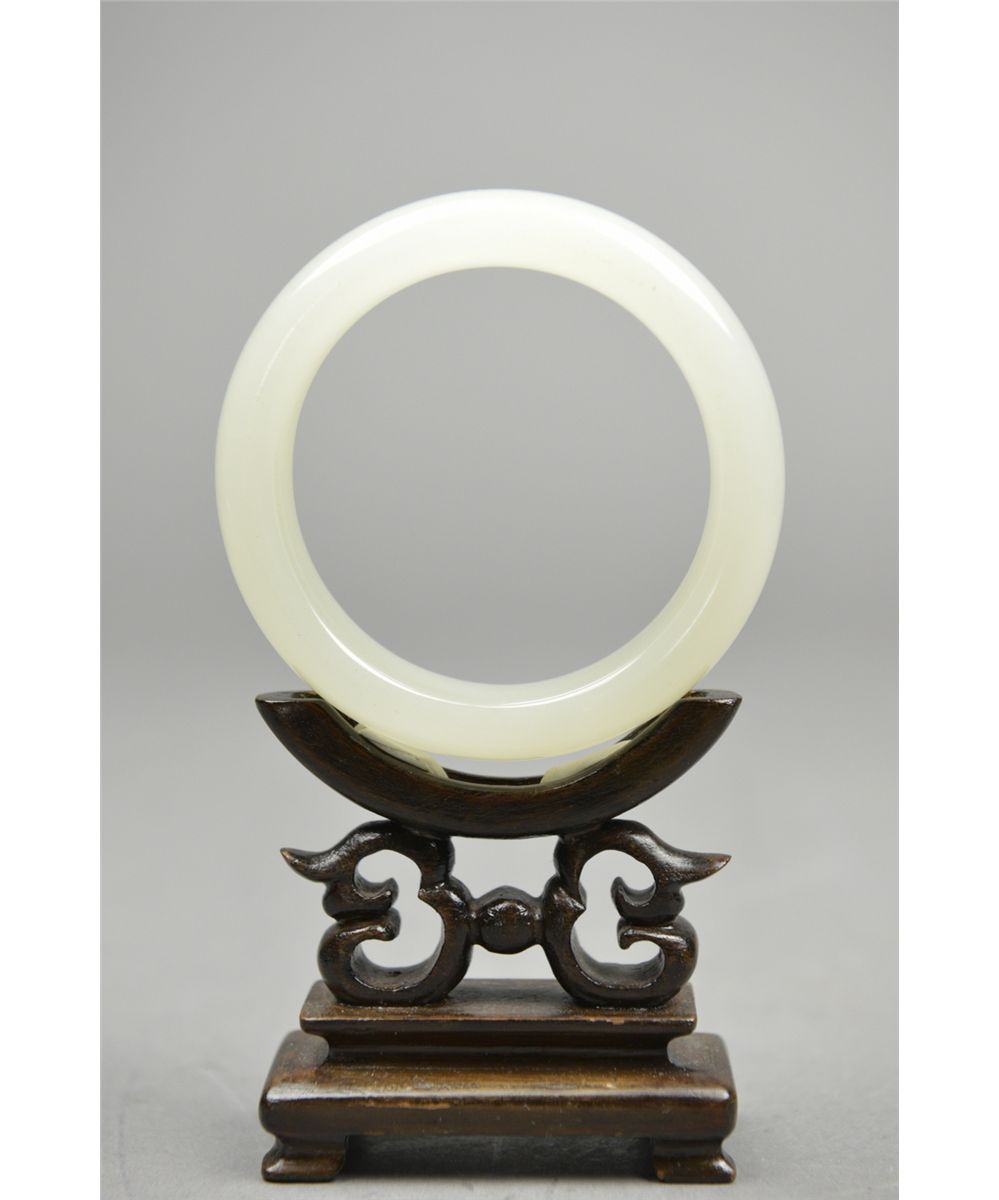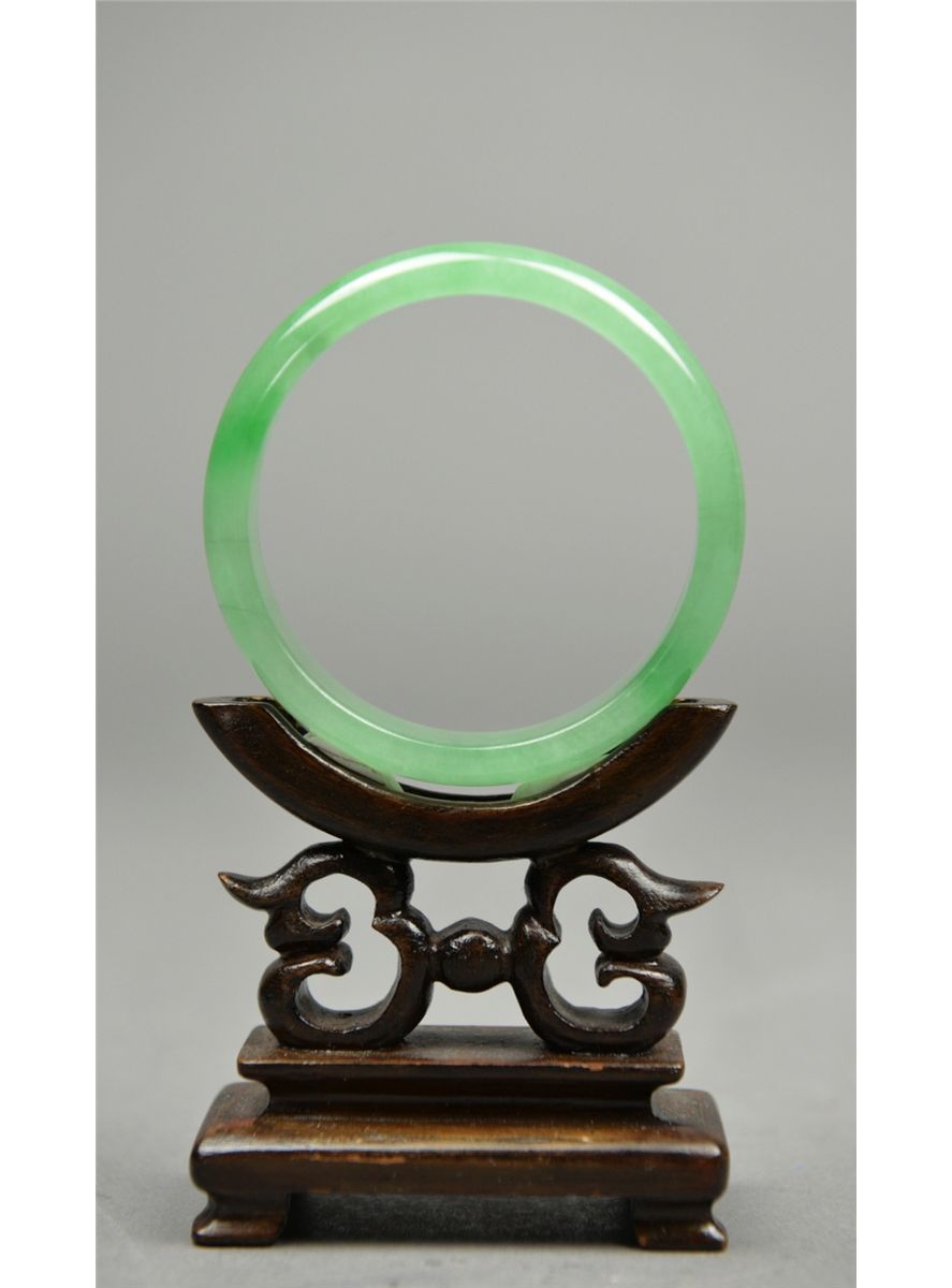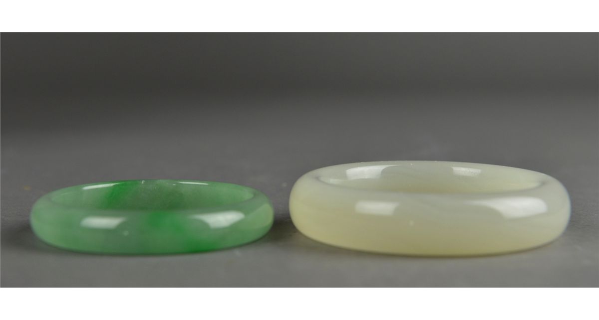 Set of two Chinese carved jade bangles; one bangle with stone of translucent white tone; the other of translucent green tone (stand not included); D: 8 cm, 90 grams (1); D: 7 cm, 42 grams (2)