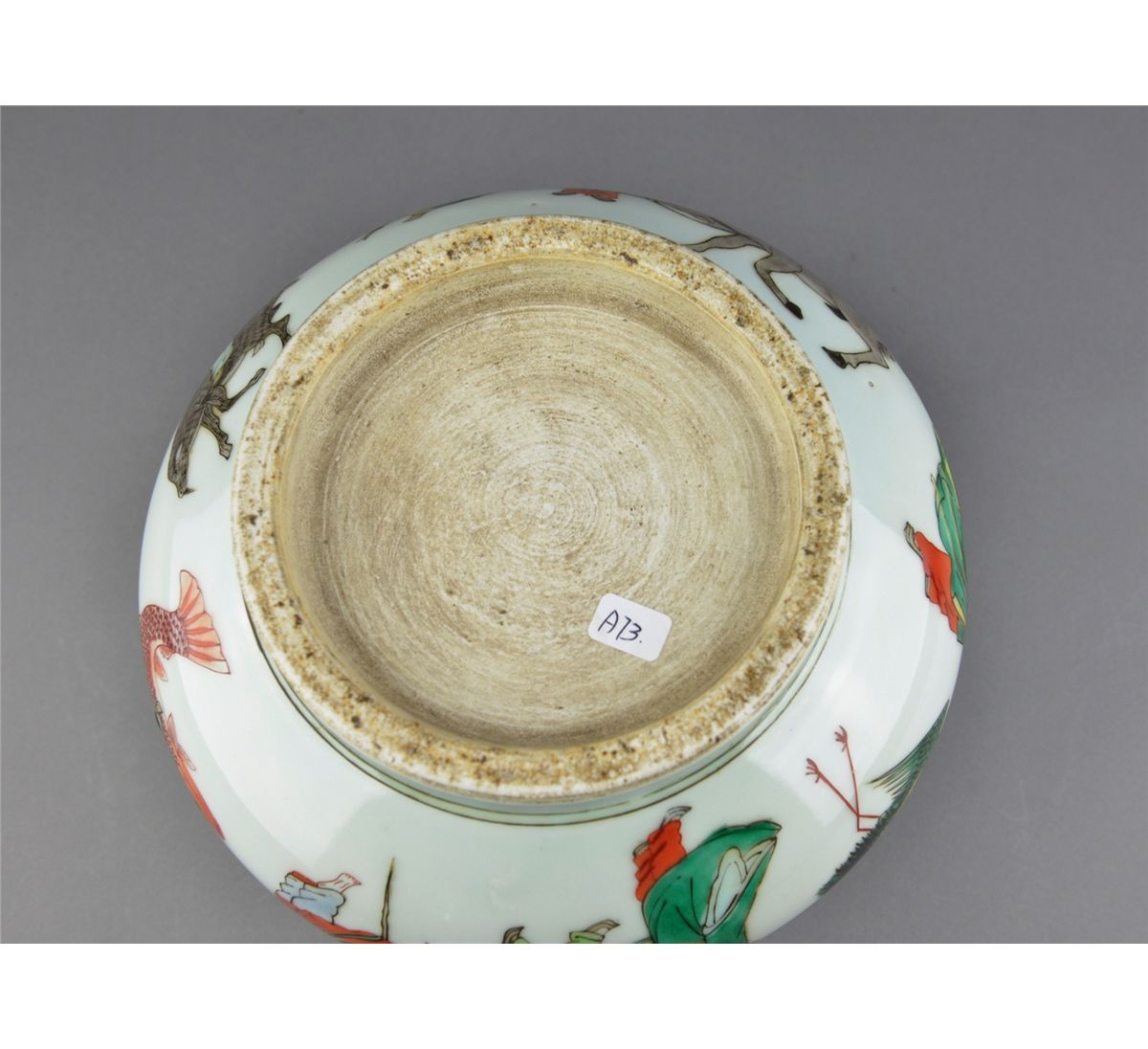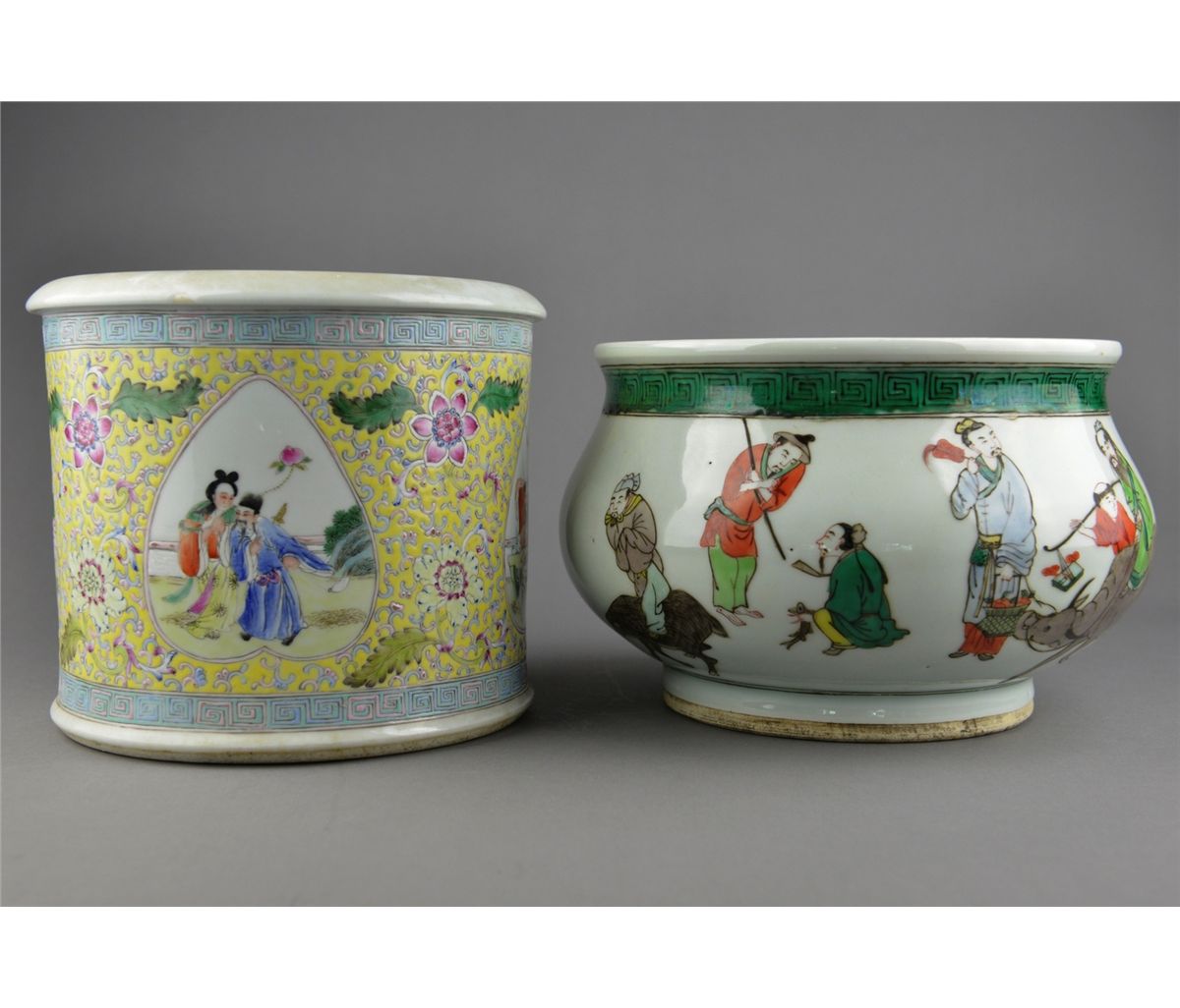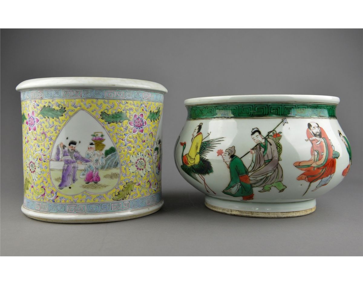 Set of two Chinese porcelain brush pot and fish bowl; D: 26 cm, H: 15 cm (fish bowl); D: 17.5 cm, H: 21 cm (brush pot)