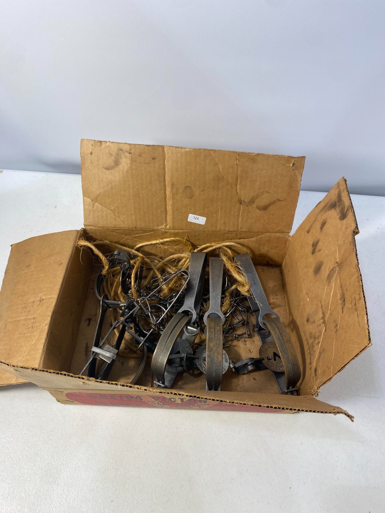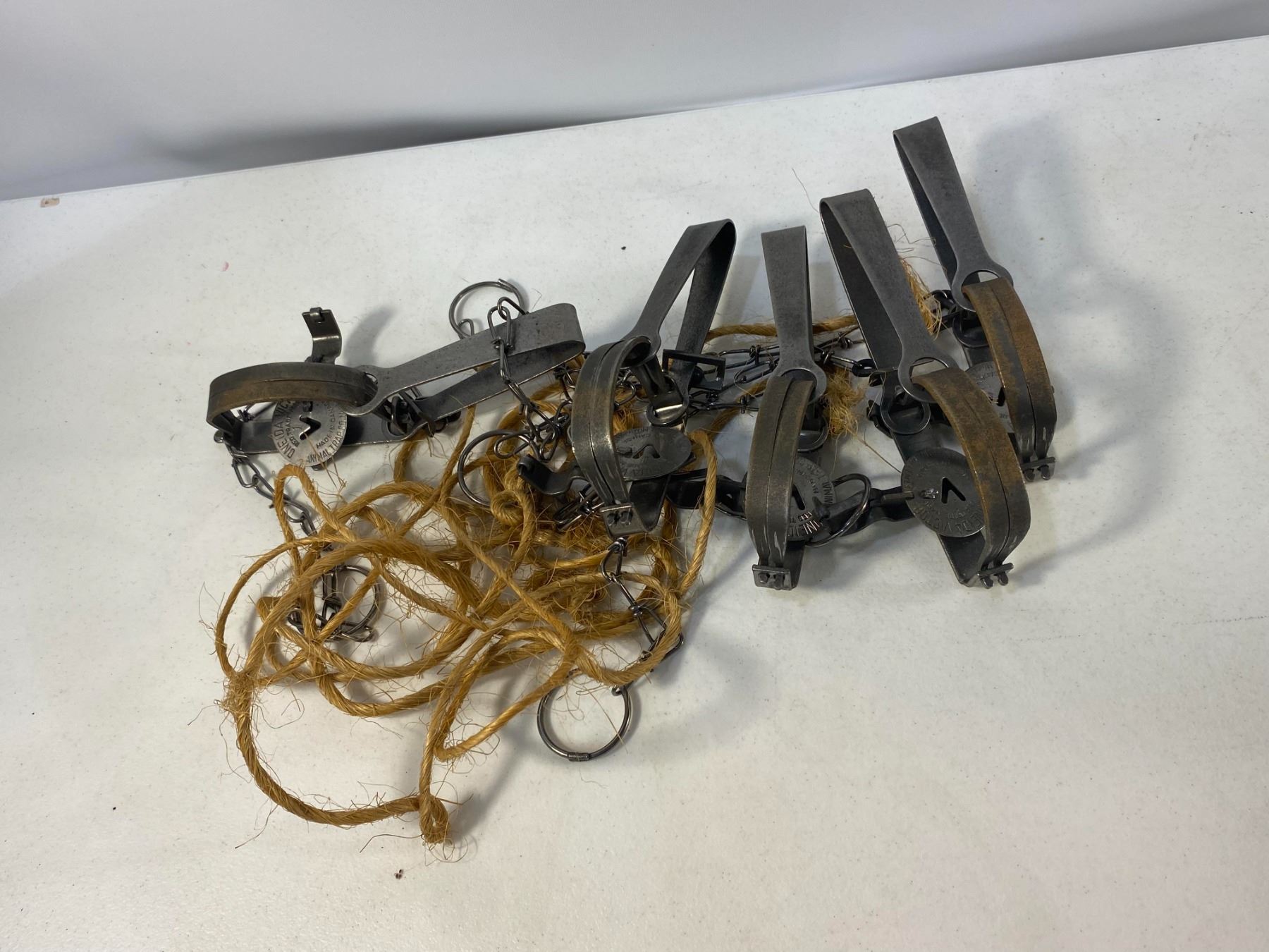 Grouping of vintage metal leg-hold traps with attached chains and rope. Approx. mid-century. Condition: rust and wear from age.