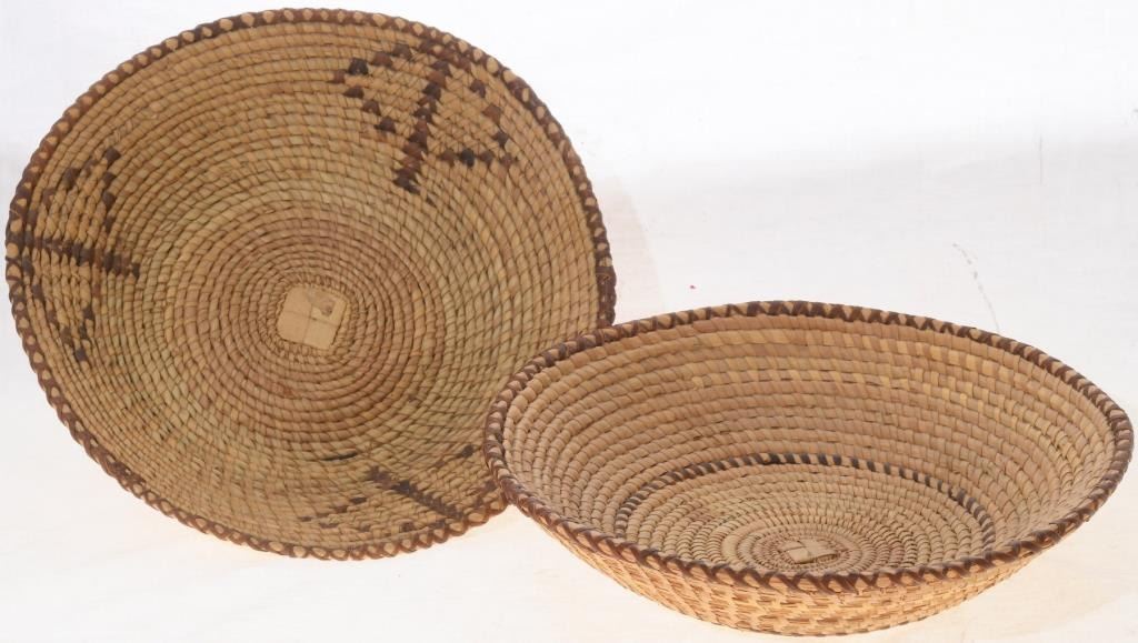 This pair of older hand-woven Seri Indian Baskets are each 9.5” wide by 2.5” deep. They both have a two-tone stitch, and one has a simple figural design. Composed of natural grasses and yucca.