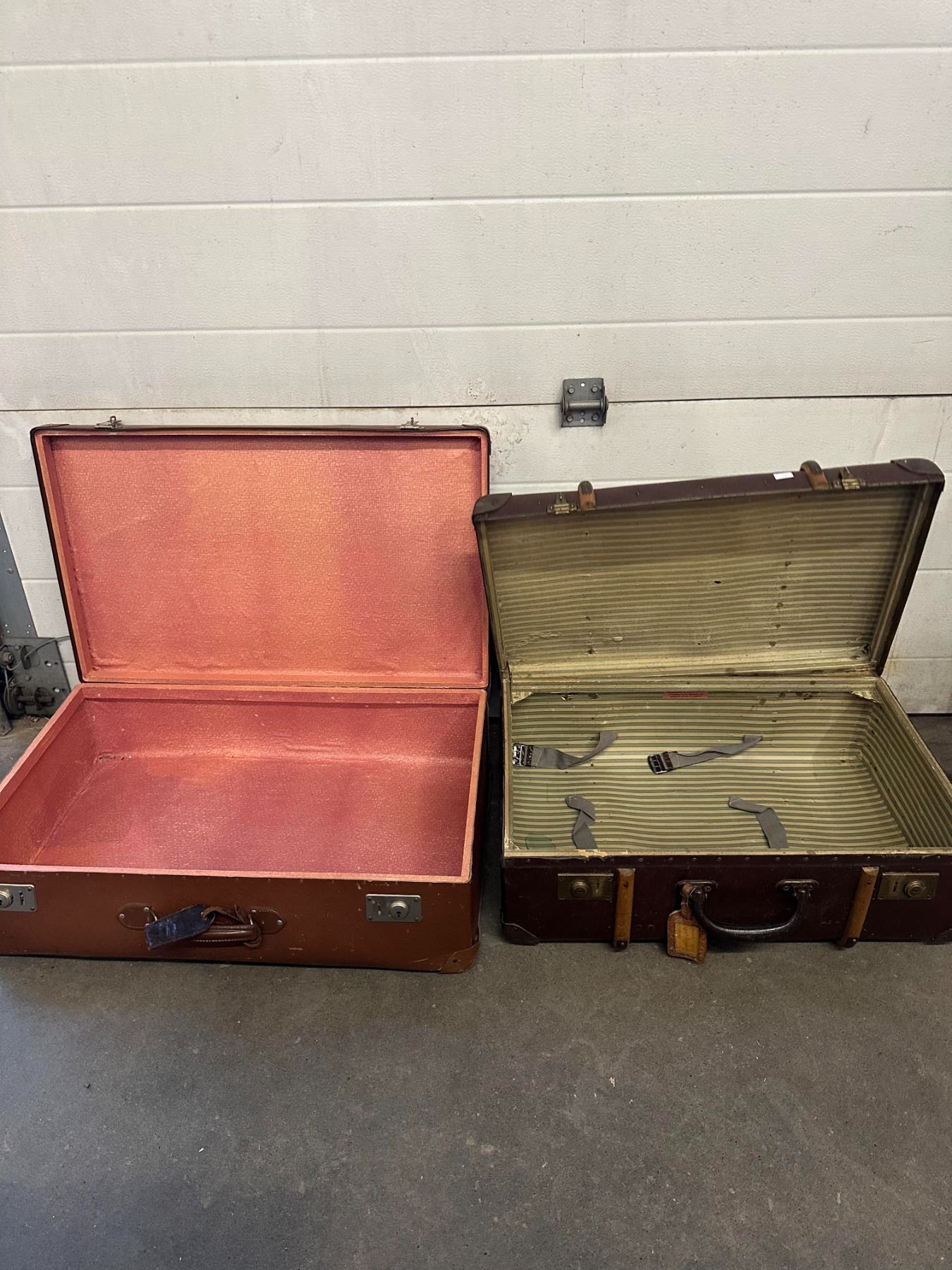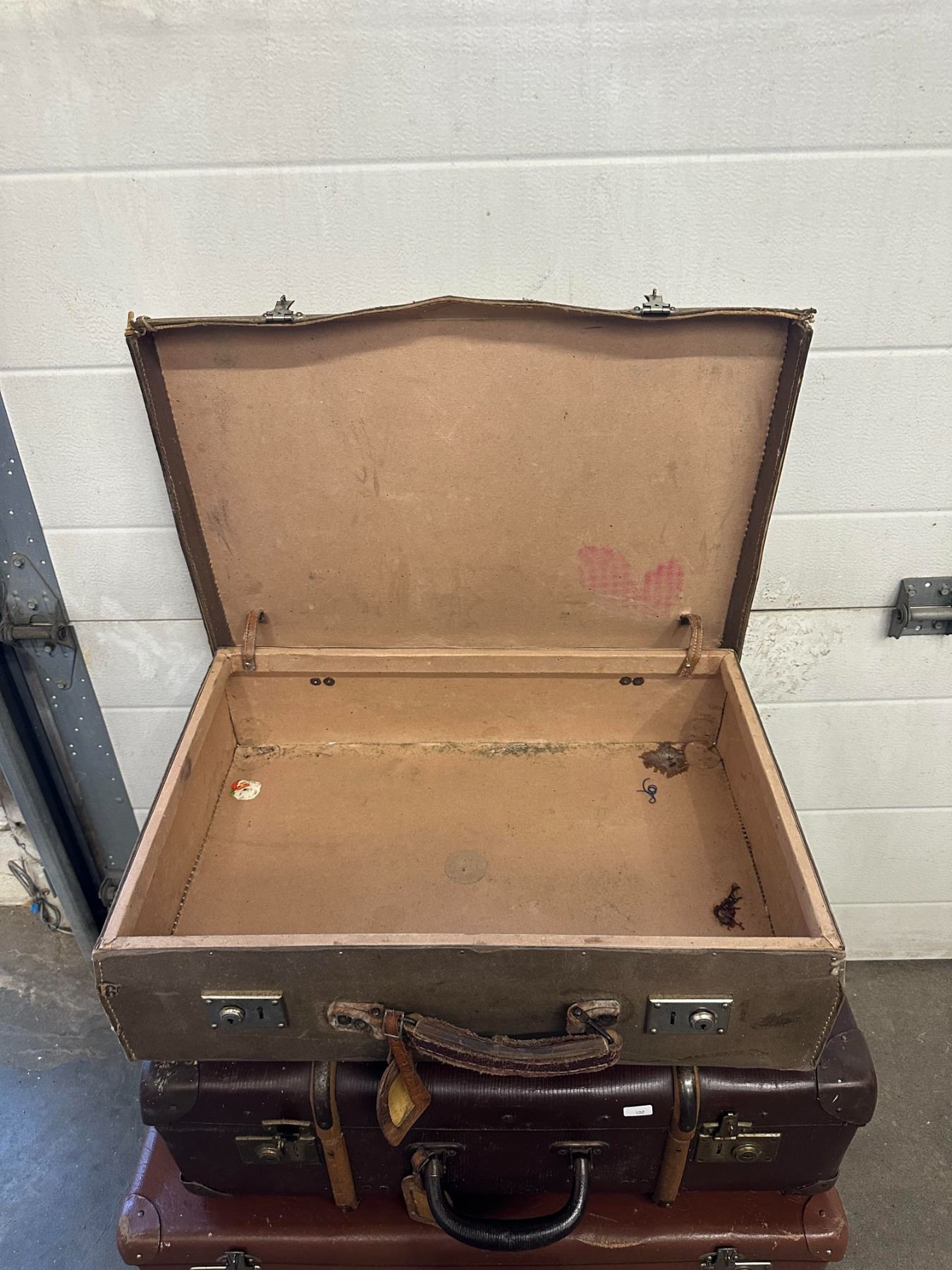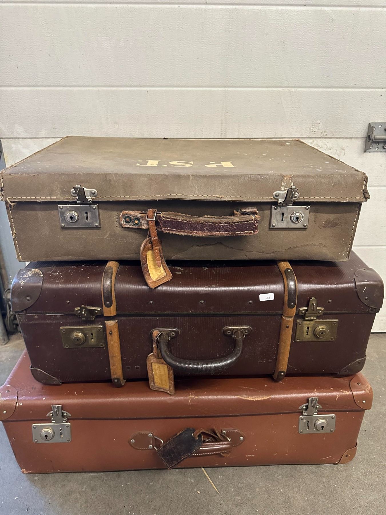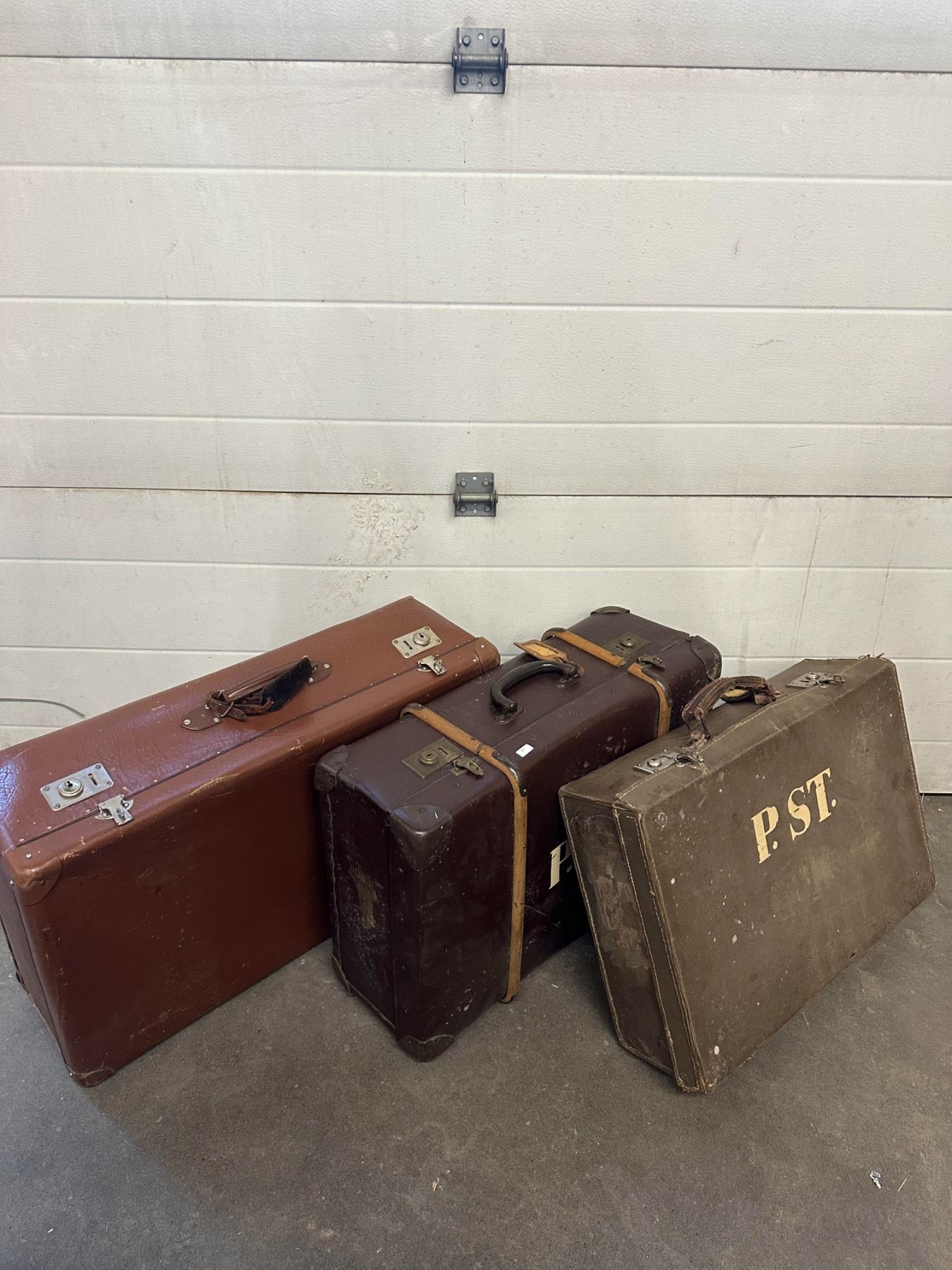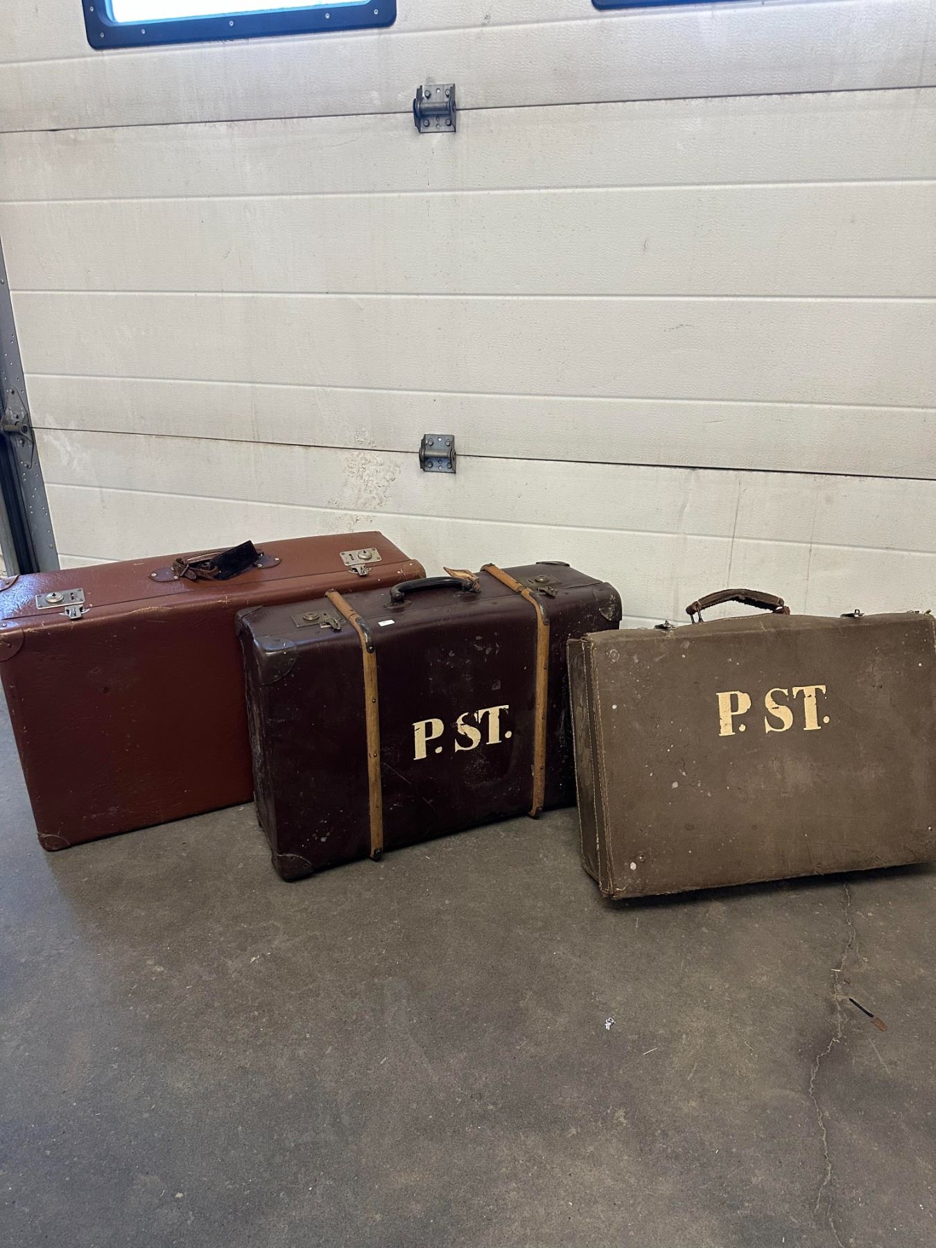 Lot includes three vintage suitcases, two marked 'P.ST.'; age wear, scuffs, and travel use.