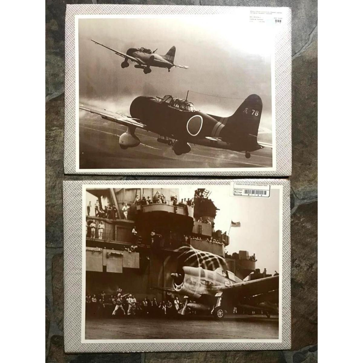 Set of vintage-style World War II aircraft carrier wartime photo prints. Sepia tone, showing a U.S. airplane on aircraft carrier with propeller trails & two Japanese Zeros taking off from an aircraft carrier. 11" X 14" each, in original packaging from The American Heritage Gallery in Atlanta Ga.Â