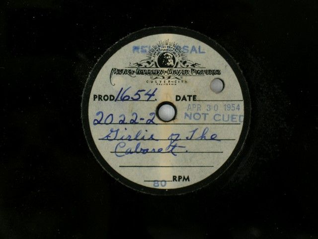 Right out of the archives of MGM’s legendary recording studios of the 1940’s and 1950’s these are the extremely rare original steel and vinyl Master Record disks that are "cut" during the original recording sessions. They are used both for the final master mix of the entire film, and also played during rehearsals with the actors and dancers, and used during the actual production as play-back on the sound stages. These master recordings are from some of the most famous MGM musicals of all time, including “The Bandwagon”, “Seven Brides For Seven Brothers”, and “Always Fair Weather”. Also included are the MGM classics "This Time For Keeps" "Give A Girl A Break" and "Deep In My Heart". Includes a CD transfer of everything recorded on the masters, including the fully orchestrated music, all the outtakes, countdowns, false starts and cross-talk between the musicians, composers, singers, conductors, and engineers. It’s as if you were right there when these classic recordings were first made! Some of the many voices on these two sided masters (recorded in 80 RPM!), are Gene Kelly, Dan Dailey, Michael Kidd, Debbie Reynolds, Jose Ferrar, Jimmy Durante, Xavier Cugat, Esther Williams, Marge and Gower Champion, Vic Damone. Howard Keel, Jane Powell and Nanette Fabray as well as some of the most famous "ghost singers" in Hollywood. One of the largest collections of Master Recordings in one place ever offered. This lot includes 14 double sided master disks all with their original labels.