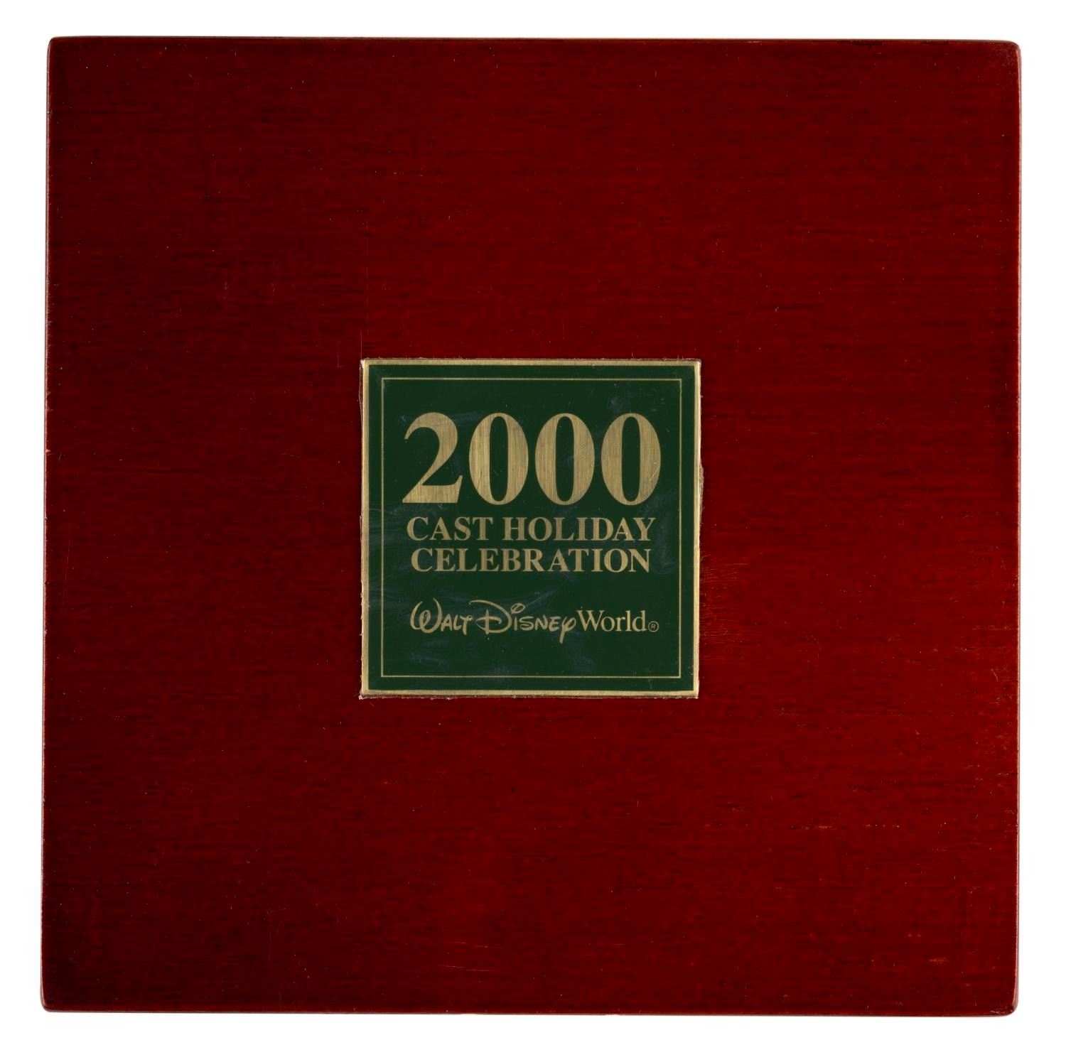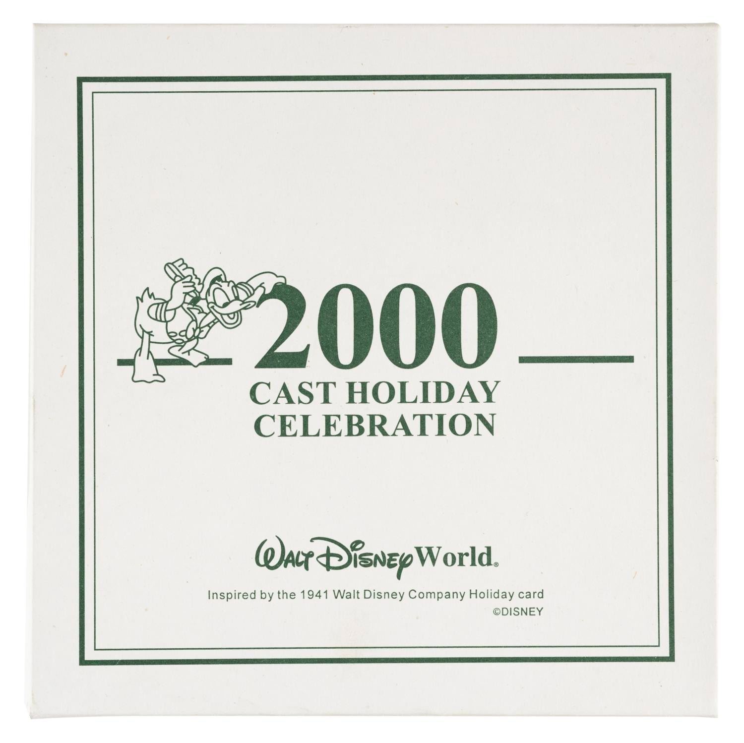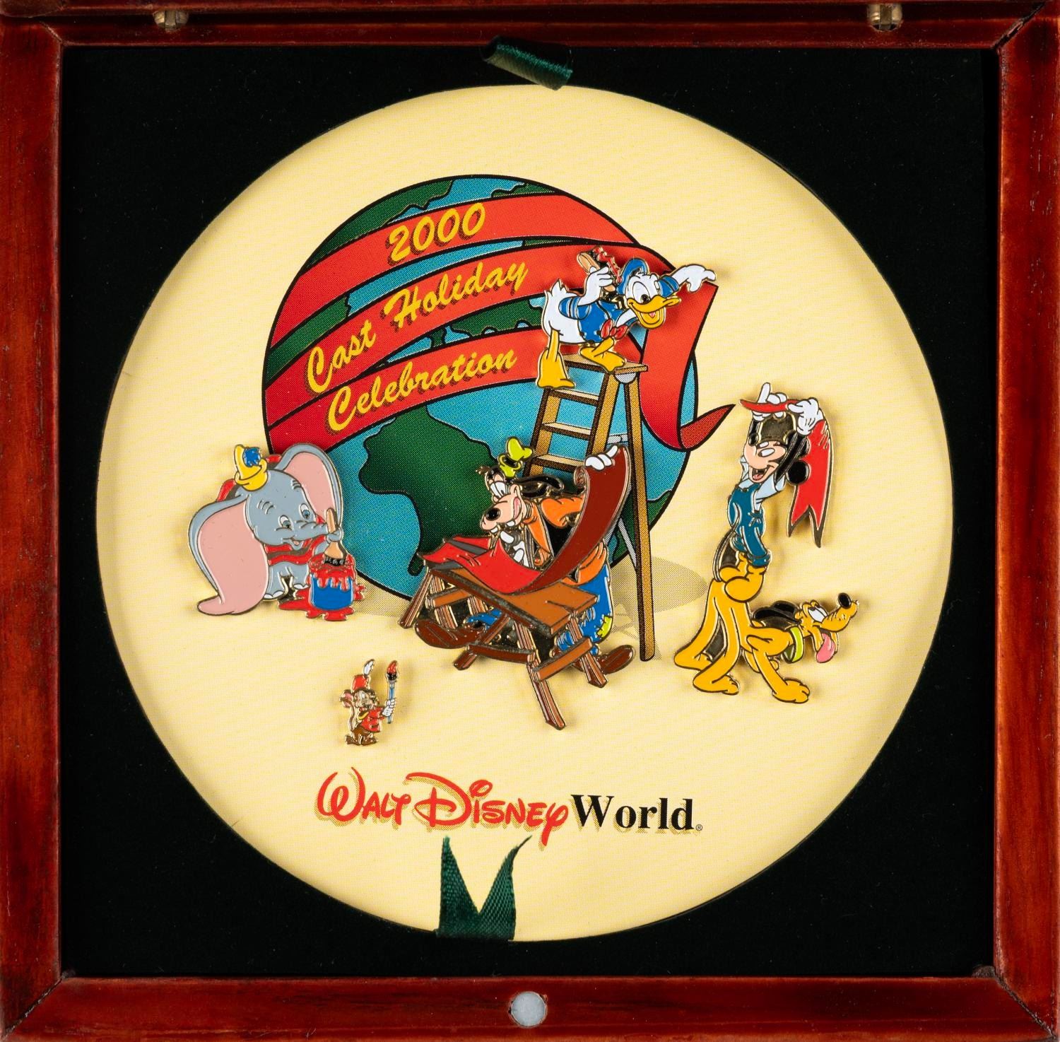 (Walt Disney World, 2000) A set of five Cast Member-exclusive Holiday Celebration pins inspired by the 1941 Walt Disney Company Holiday Card. The pins feature Goofy, Mickey, Pluto, Donald, Dumbo, and Timothy Mouse. Ranging in size from 0.5” x 0.5” to 1” x 1.75” and housed in a 6” x 6” wooden box and its original 6.25” x 6.25” package, the pin set is in very good condition with light wear.