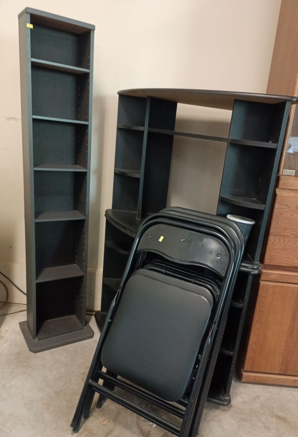 Set of a Black TV Stand (38W, 24D, 54T), Shelf (11W, 12D, 62T), and 4 Black Foldable Chairs