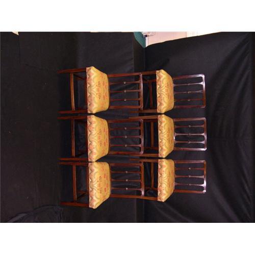 Lovely set of 6 late 18th Cty. English carved mahogany dining chairs, Ca. 1790-1800, with repadded and custom upholstered slip seats. The seats are done in a colorful polychrome floral damask fabric, featurings tulips and foliate scrolls in shades of red and green, the aprons bordered by swagged brass tacking. Dimensions are pretty standard for chairs of this period, and will work with a table of later date (seats are at a comfortable level for a later period dining table). They are approximately 20" wide at the seat front, and chair backs are in the range of 39". They have been gone over by my cabinetmaker, and all chair rails have been repaired for some worm damage, and all joints have been cleaned and reglued, so these are very usable and a large person is comfortable on them, without fear of coming apart or loose. They have a nice vintage patina on the wood's surface, and the backs are square in shape, with the vertical splats interrupted by small carved rosettes. There is some wear to the medial stretchers joining the legs.