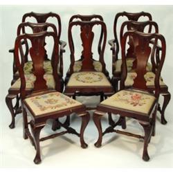 Set of eight good quality 1920s reproduction Georgian dining chairs with carved splats, needlepoint upholstered drop in seats and shell carved cabriole legs, united by an H-stretcher