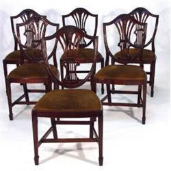 Set of eight mahogany framed shield backed dining chairs carved with wheatsheaves on tapering legs with splayed feet