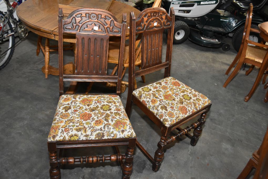 Set of five mid 20th century oak dining chairs with heavy pressed backs and upholstered seats