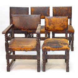 Set of five oak framed chairs with turned supports and leather upholstered backs and seats