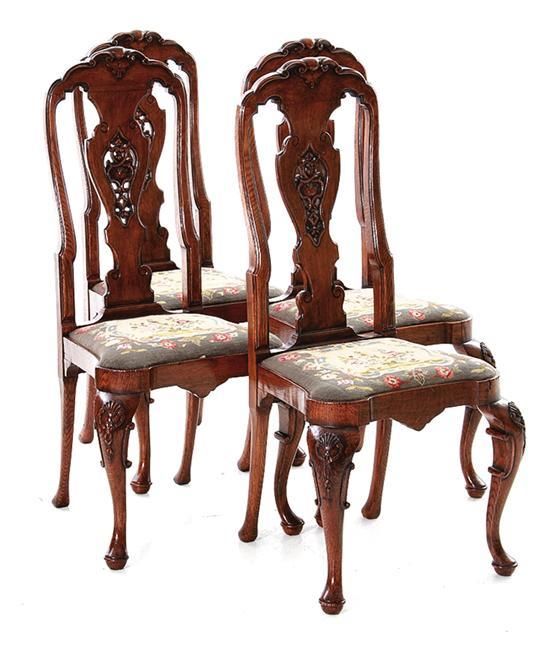 Set of four Queen Anne style transitional carved oak side chairs 19th century, shaped carved crestrail above carved and pierced vasiform splat flanked by shaped stiles and seatrail retaining slip seat with needlework cover, on cabriole le